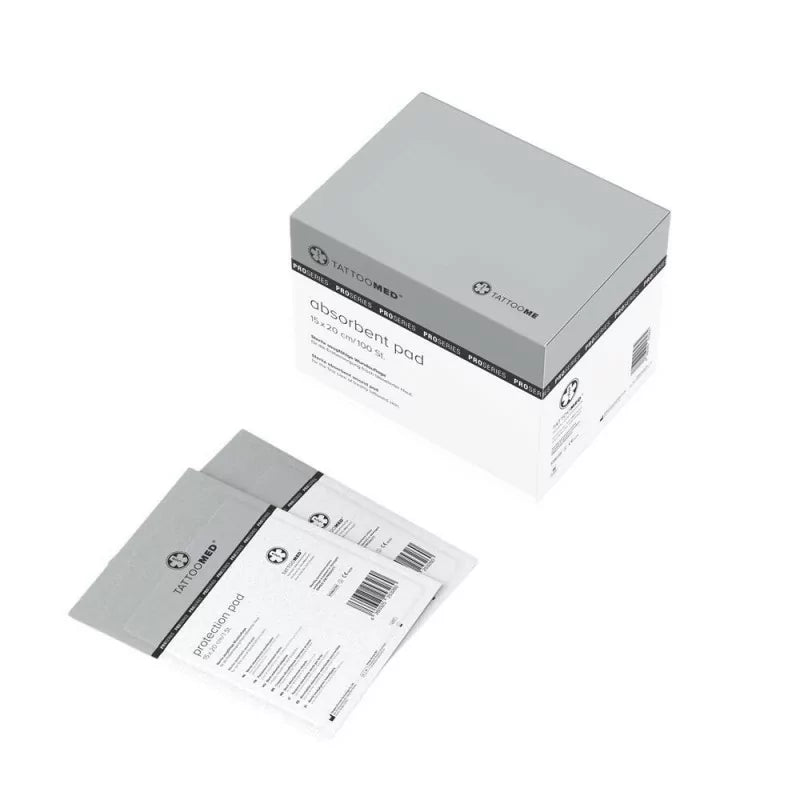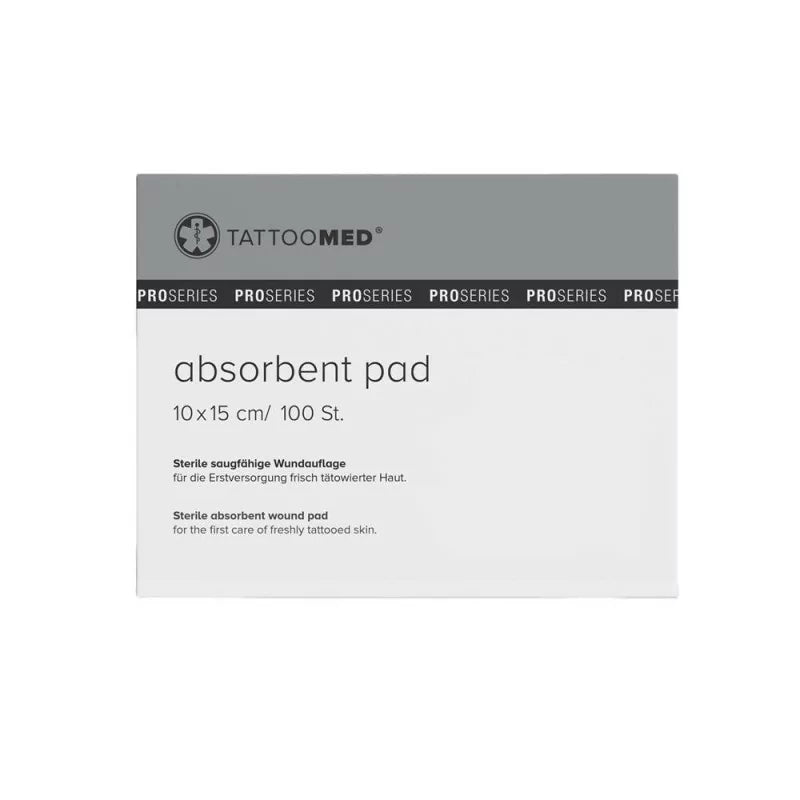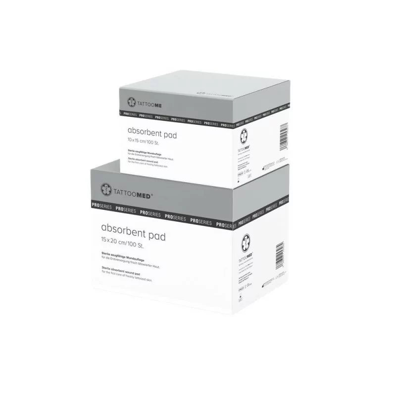 TattooMed Absorbent Pad es un apósito profesional y estéril diseñado para el cuidado inicial crucial de la piel recién tatuada. Disponible en tamaños 10x15cm o 15x20cm, cada paquete contiene 100 almohadillas altamente absorbentes, lo que lo hace ideal para estudios y rutinas de cuidado posterior.