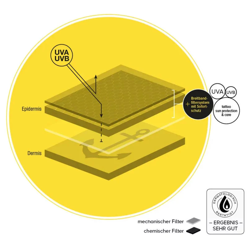 Aplica generosamente sobre la piel tatuada antes de la exposición al sol. Reaplica regularmente, especialmente después de nadar o sudar, para mantener una protección óptima.