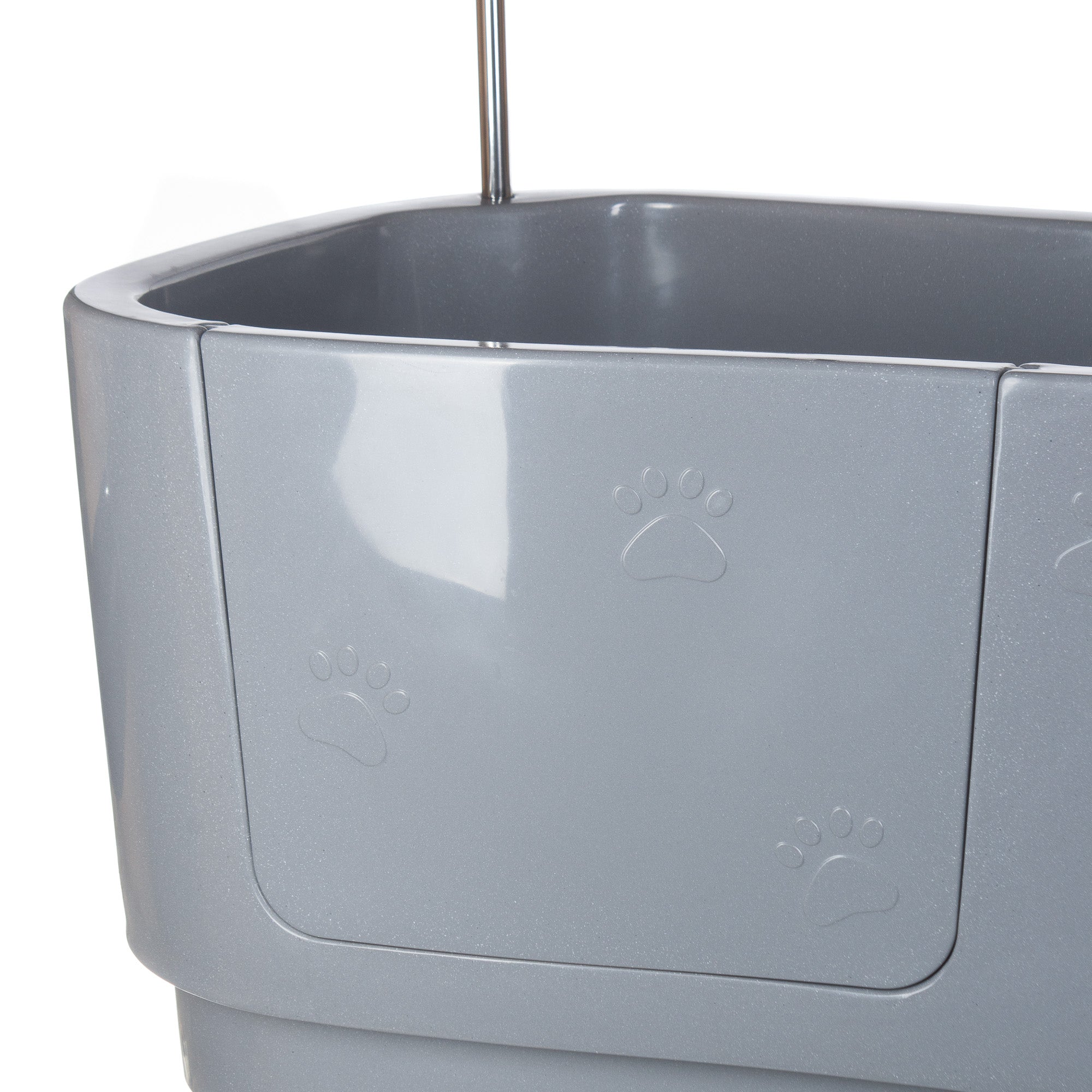 Grande y sólida bañera para peluqueros equipada con una repisa de plástico desmontable, que facilita los tratamientos también para pequeños cuadrúpedos, así como con puertas laterales para una entrada cómoda al tratamiento. El brazo está equipado con 3 correas. Muy fácil ajuste de altura mediante interruptores de pie. Dimensiones muy grandes de la bañera, gracias a las cuales podemos acomodar aquí a un cuadrúpedo realmente grande. En el borde de la bañera hay un organizador para botellas de cosméticos. La cubeta de la bañera tiene un fondo antideslizante. Toda la estructura es muy estable incluso con una gran carga, y la bañera misma está hecha de polipropileno duradero.