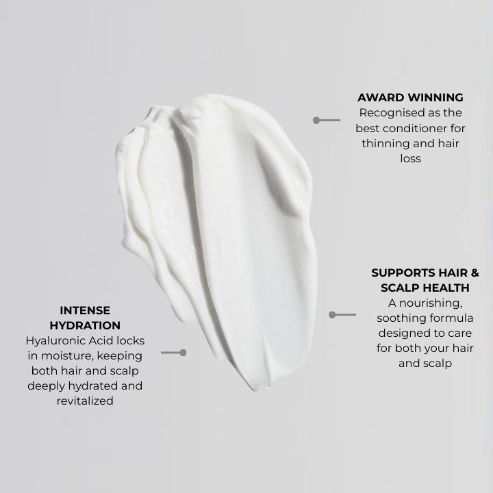 Este acondicionador ligero y nutritivo está formulado científicamente para cabello fino y con pérdida. Enriquecido con ácido hialurónico para una hidratación profunda, calma el cuero cabelludo mientras fortalece las fibras capilares sin apelmazarlas.