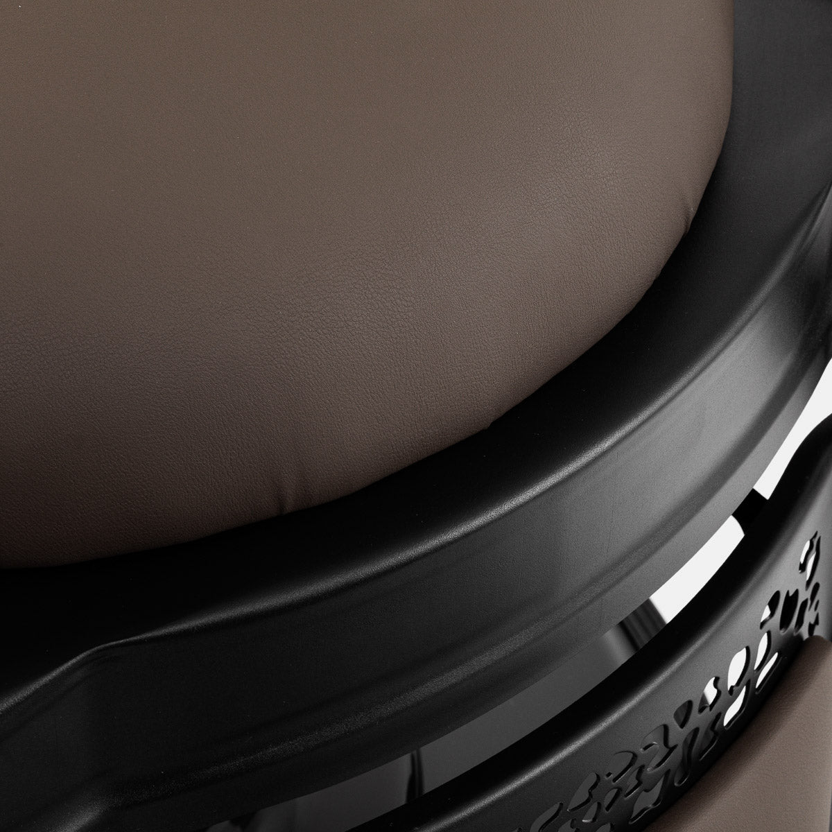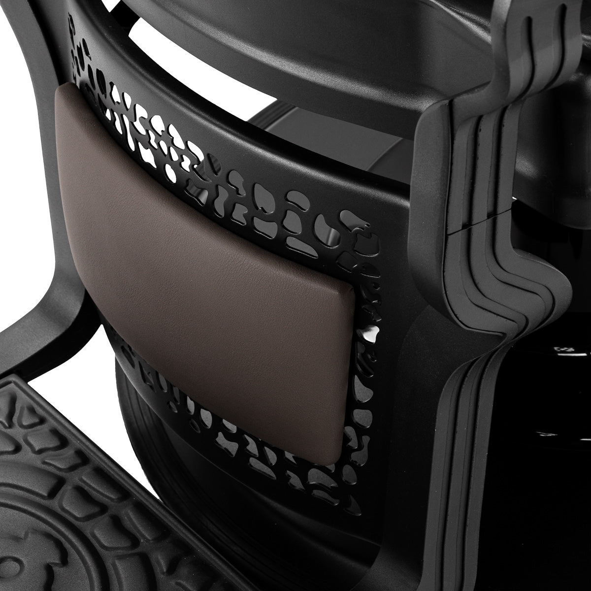 Una construcción de base sólida garantiza estabilidad y un alto confort de uso. El relleno del asiento hecho de espuma duradera y resistente a la deformación y la tapicería de cuero sintético agradable al tacto con acabado mate aseguran durabilidad a largo plazo y uso cómodo del mueble. Los materiales utilizados también hacen que el equipo sea resistente a la humedad, duradero y fácil de limpiar. La cubierta en tonos marrones junto con el reposapiés decorado, le da un carácter único. La silla, con su diseño distintivo que hace referencia al estilo vintage, encaja perfectamente en la atmósfera de las barberías, realzando su ambiente único.