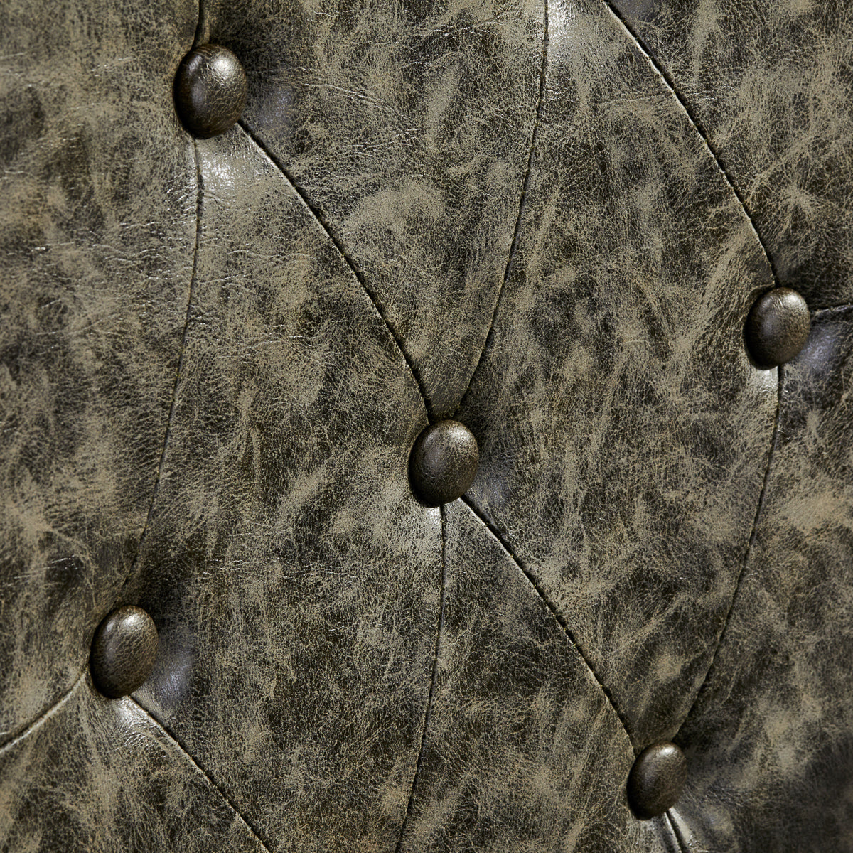 La construcción sólida de la base garantiza estabilidad y alto confort de uso. El relleno del asiento está hecho de espuma duradera y resistente a la deformación, y la tapicería es de cuero sintético agradable al tacto con un acabado desgastado, parcialmente mate y con efecto envejecido, asegurando la durabilidad del mueble y su uso cómodo durante mucho tiempo. También hacen que el equipo sea resistente a la humedad, duradero y fácil de limpiar. La cubierta en tonos verdes con acolchado y botones decorativos le da un carácter único. La silla con un diseño característico, que remite al estilo vintage, encaja perfectamente en la atmósfera de las barberías, enfatizando su ambiente único.