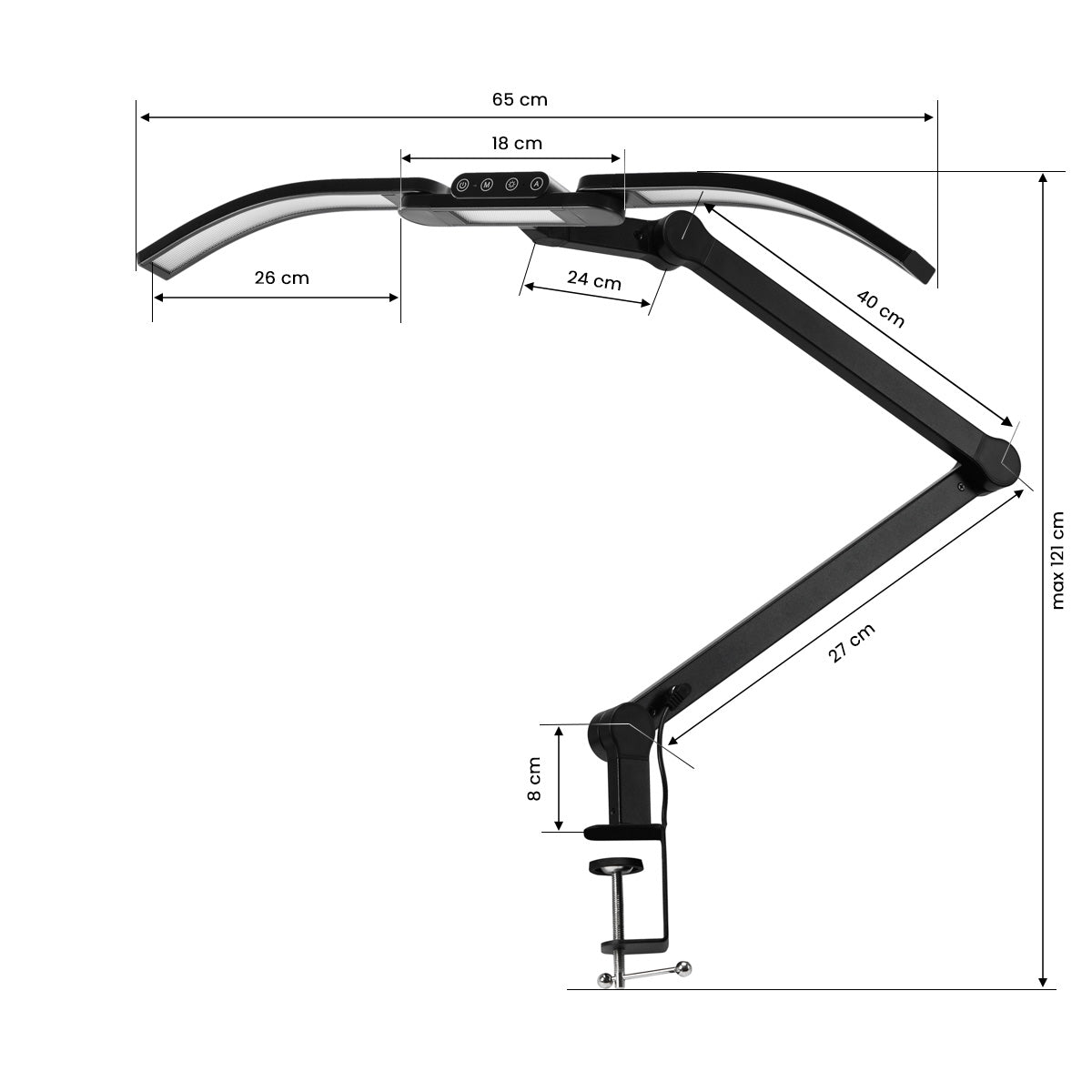 La forma delgada y geométrica de la lámpara llama la atención con su apariencia moderna pero atemporal. La combinación de color blanco con acabado mate le da al diseño un carácter elegante y profesional que encaja perfectamente en interiores minimalistas de salones de belleza. El montaje sobre la mesa es posible gracias a una abrazadera tipo tornillo con una apertura máxima de 6.3 cm, adecuada para la mayoría de las superficies. El conjunto crea un equipo coherente y estético que combina alta funcionalidad con un diseño refinado.