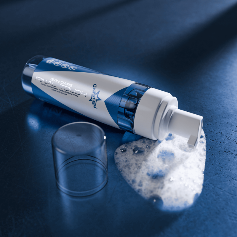 Unistar Skin Care Final Touch es un limpiador espumoso profesional desarrollado para la etapa final del proceso de tatuaje. Elimina residuos de tinta, vaselina y otros productos sin alterar la barrera hidrolipídica natural de la piel.