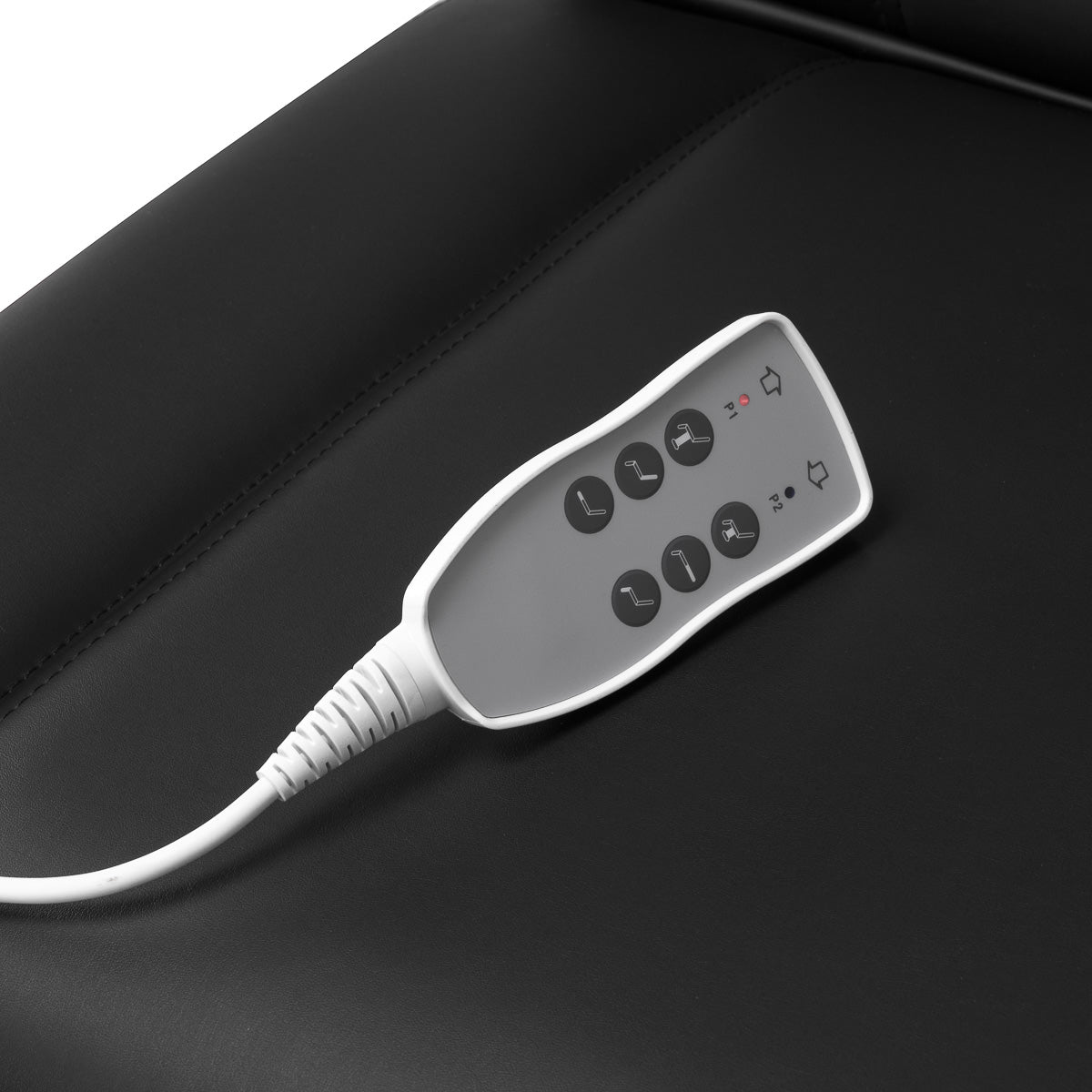 El control conveniente con un mando a distancia con cable permite ajustes precisos del sillón en tres planos: ajuste de altura, ángulo del respaldo y configuración del reposapiés. Este rango de ajuste hace posible adaptar la posición al tipo de tratamiento que se realiza, tanto en términos de comodidad del cliente como de ergonomía del especialista. Para facilitar su uso, el mando a distancia puede engancharse en los mangos ubicados a ambos lados del asiento.