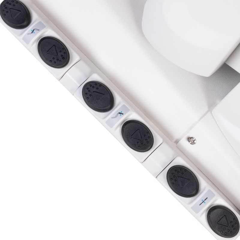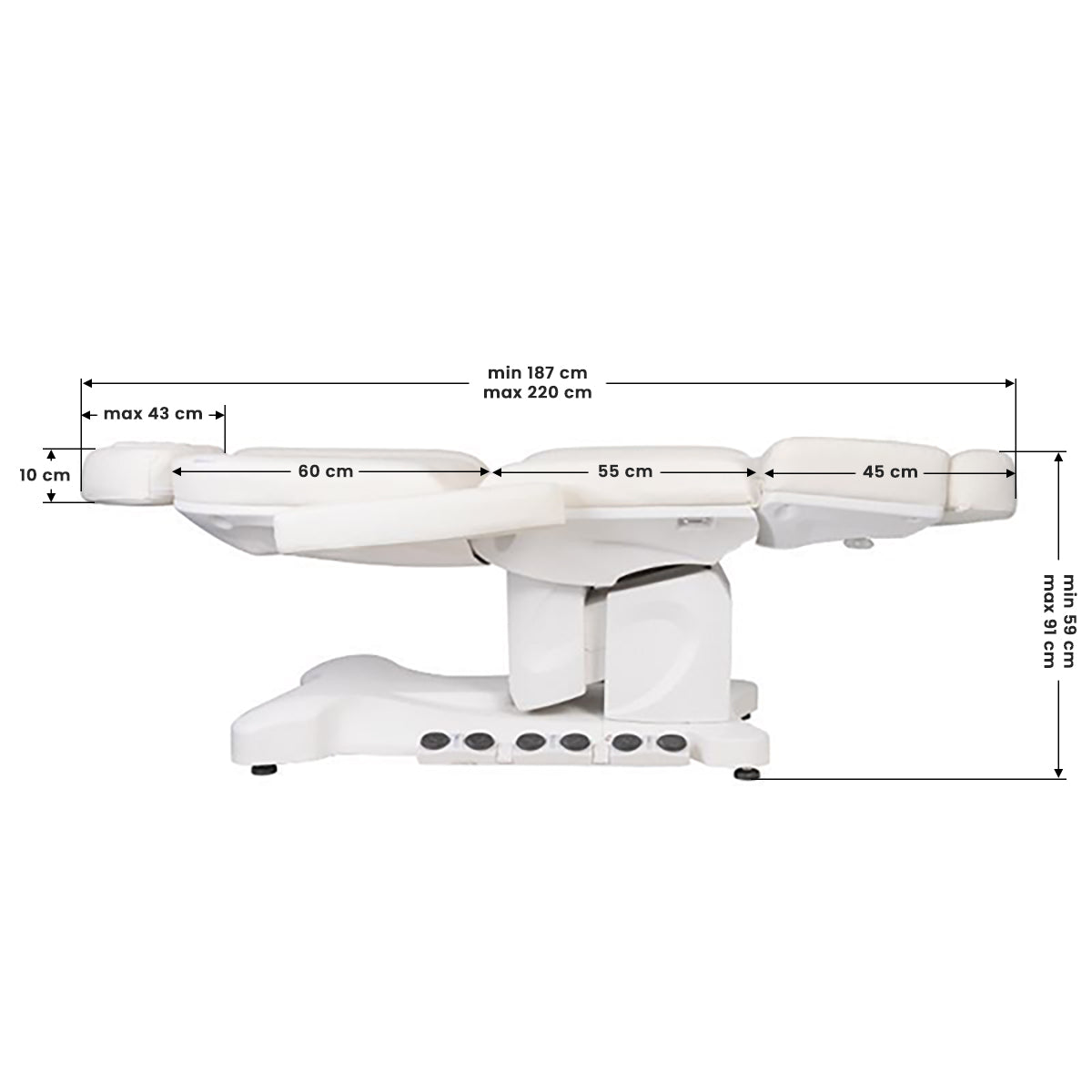 Un sillón eléctrico cosmético único, ideal para salones de belleza y salones SPA. Gracias a motores independientes, permite ajustar el sillón en 4 planos mediante un control remoto y pedales, brindando la posibilidad de tratamientos cómodos para el rostro y el cuerpo. Usando el control remoto, podemos utilizar las configuraciones programadas y activar la función HOT, es decir, calefacción. El sillón utiliza tapicería perforada, algo inaudito en otros sillones, e iluminación LED de colores en la base.
