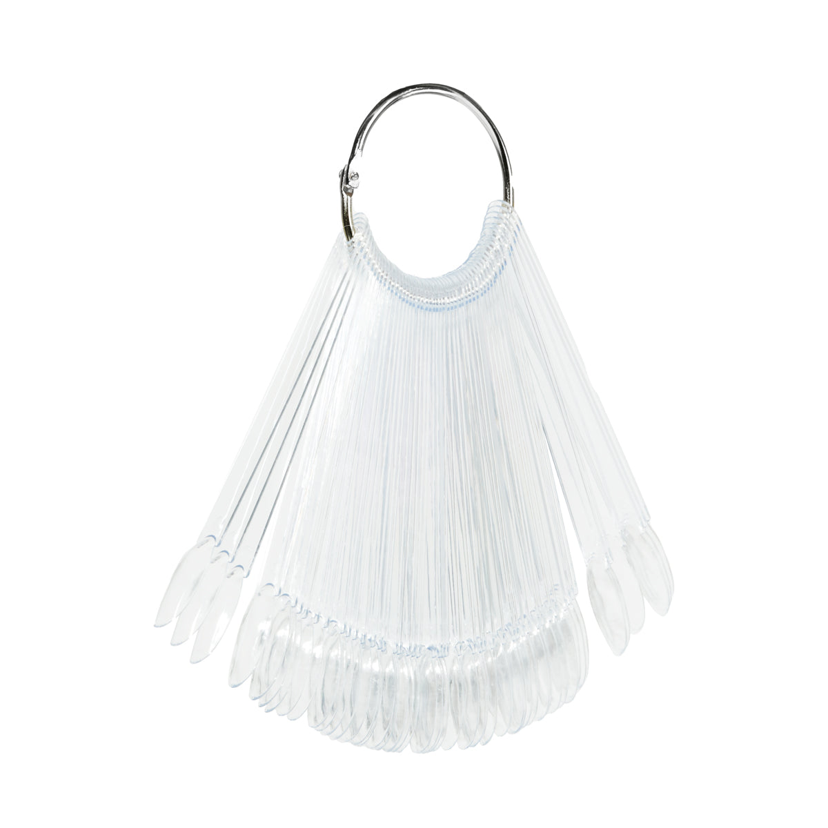 La muestra transparente permite una presentación estética de todos los colores de barnices clásicos e híbridos o geles. Consiste en 50 puntas individuales de forma ovalada y en un tamaño correspondiente a uñas reales. Está sujeta con una práctica rueda desmontable, lo que hace que sea fácil almacenar todo el conjunto. Cada punta está hecha de plástico duradero.