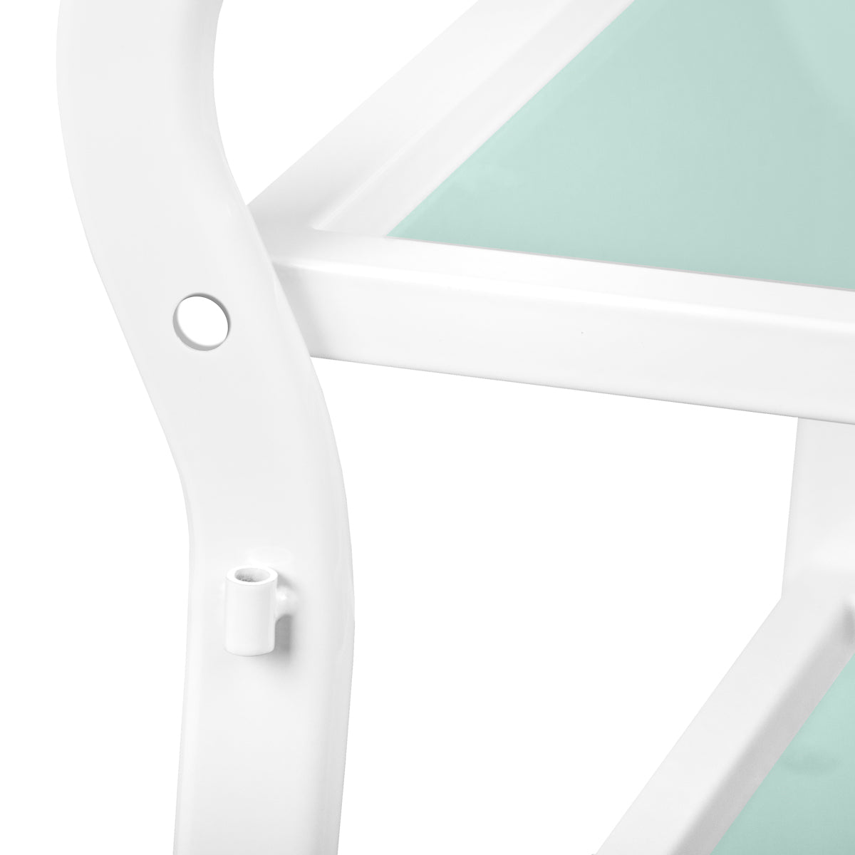 mesa para un dispositivo cosmético, hecha de metal y vidrio, con ruedas. tiene tres estantes de vidrio.