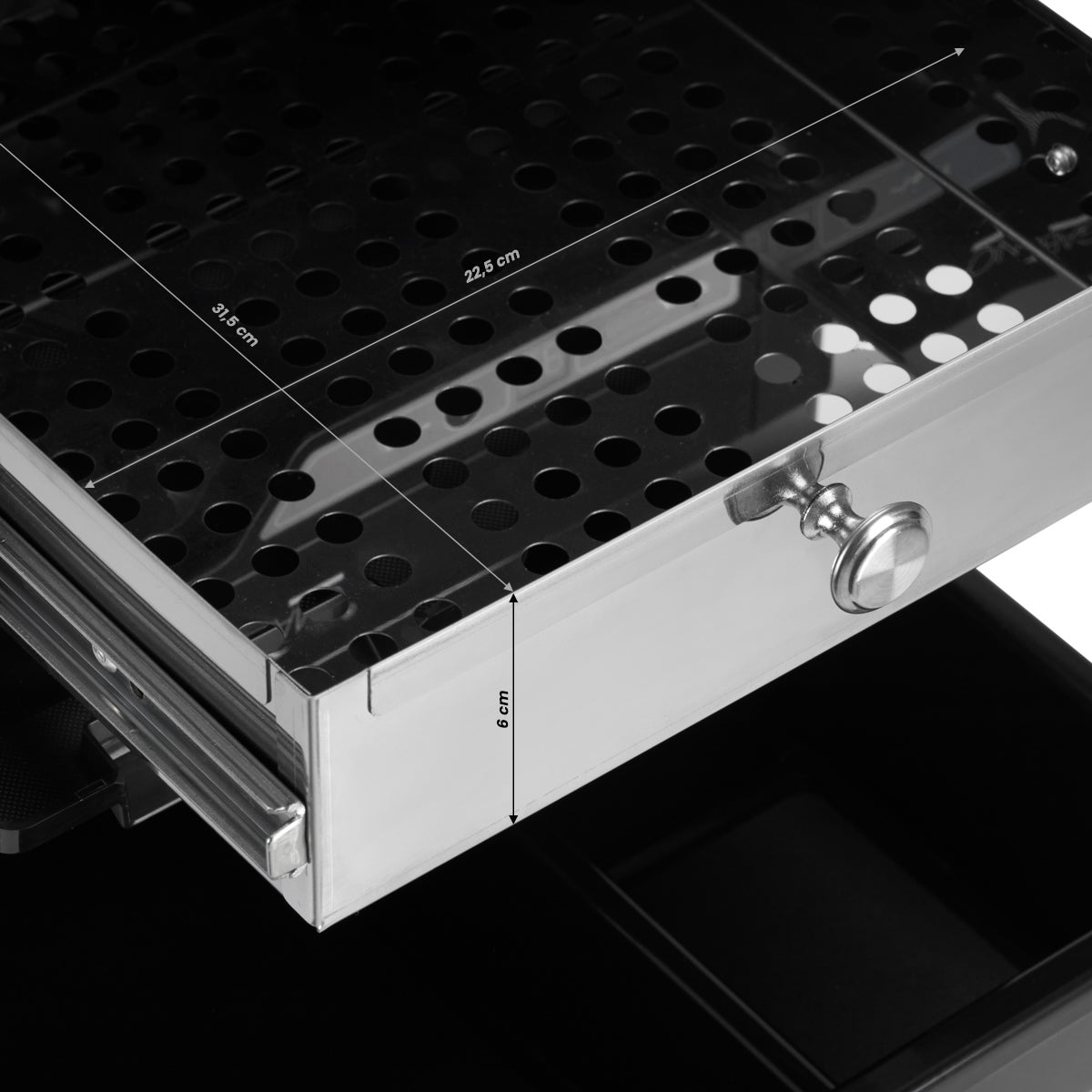 El profesional ayudante de peluquero Gabbiano 68UV con esterilizador UV es un elemento extremadamente útil del equipamiento de salón de belleza que mejorará el trabajo y permitirá cuidar el orden y la organización adecuada del lugar de trabajo. Gracias a la disposición práctica de los productos, los más necesarios estarán siempre a mano. El panel trasero incluido evita que los cajones se saquen accidentalmente en la otra dirección, lo que podría causar daños a los utensilios en su interior.
