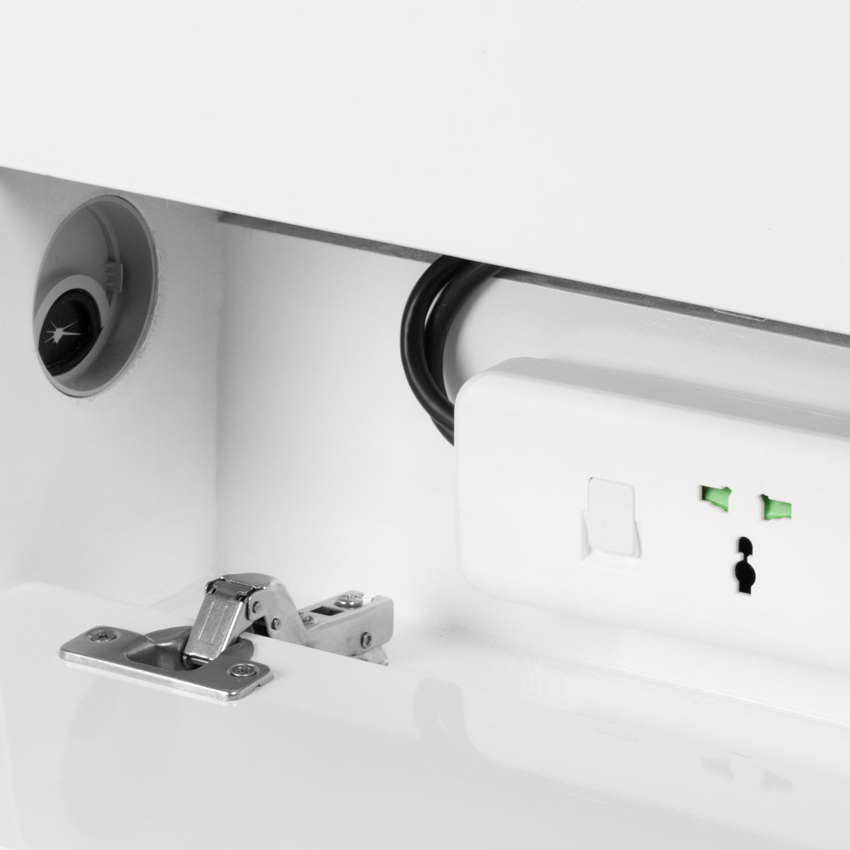 Un ayudante de podología de alta calidad es un mueble cosmético funcional con ruedas. Gracias a su movilidad, puede transportarlo a otras salas de tratamiento. El asistente tiene una encimera de vidrio, cajones para herramientas, accesorios y una repisa para una fresadora de podología u otro dispositivo. Un cajón tiene una lámpara UV-C incorporada para una mejor esterilidad de herramientas y accesorios.
