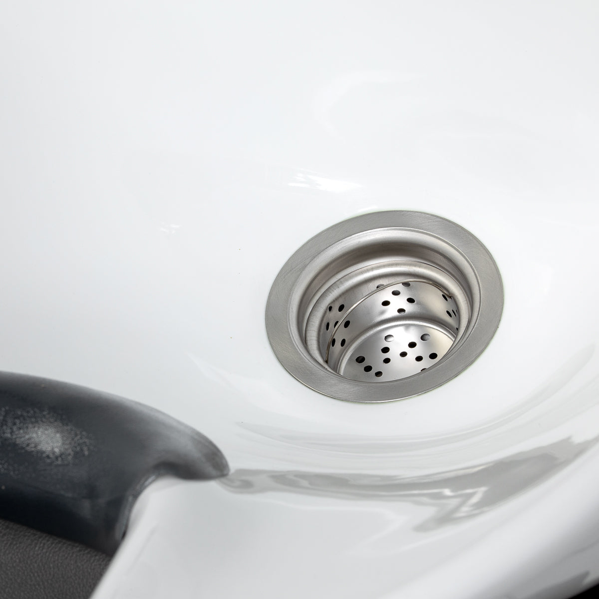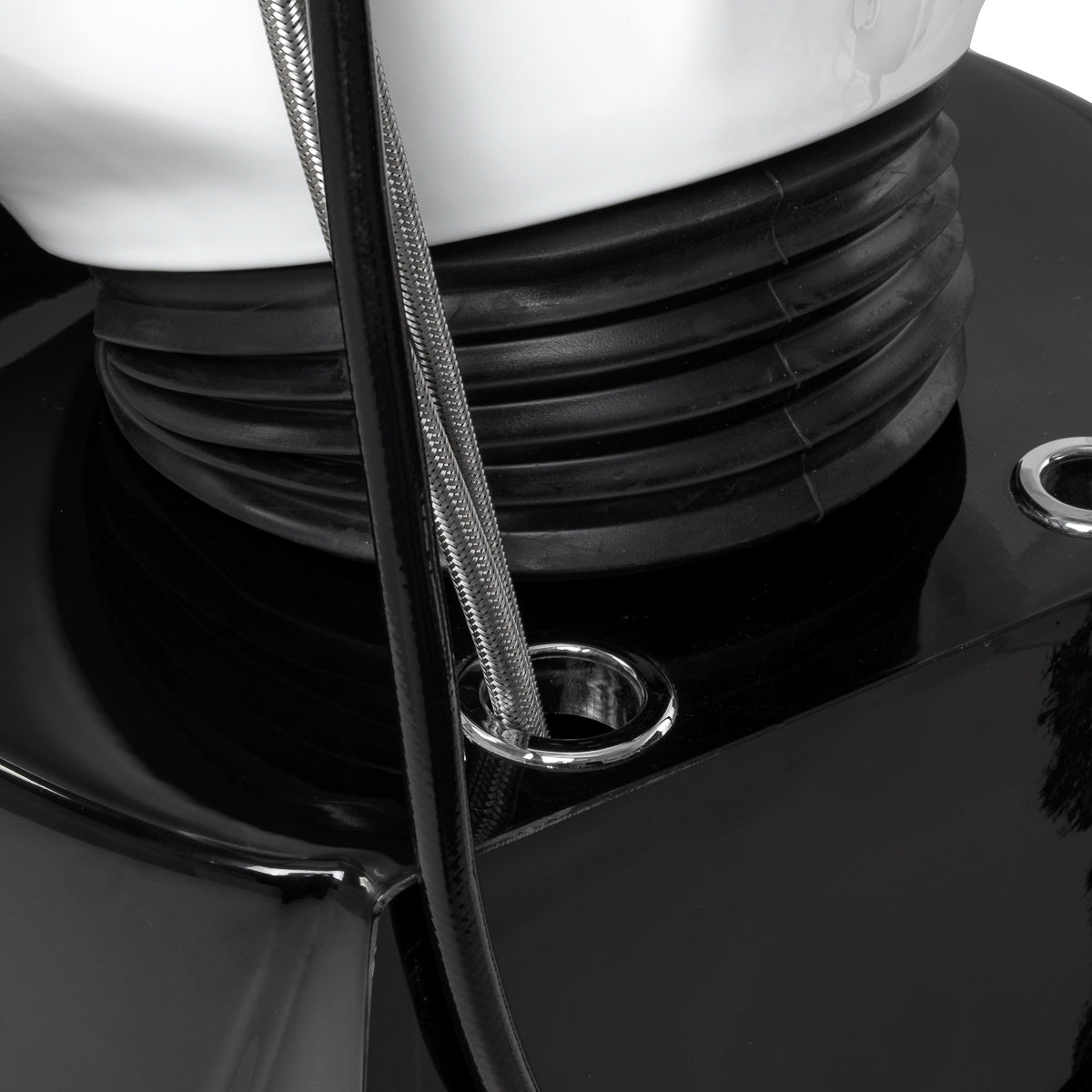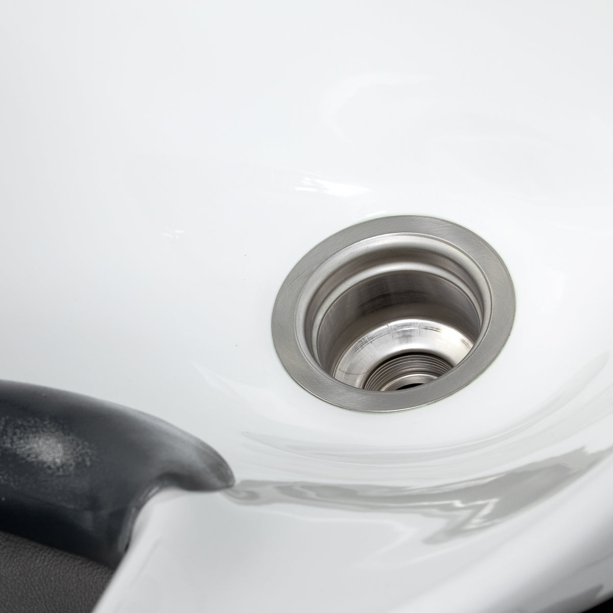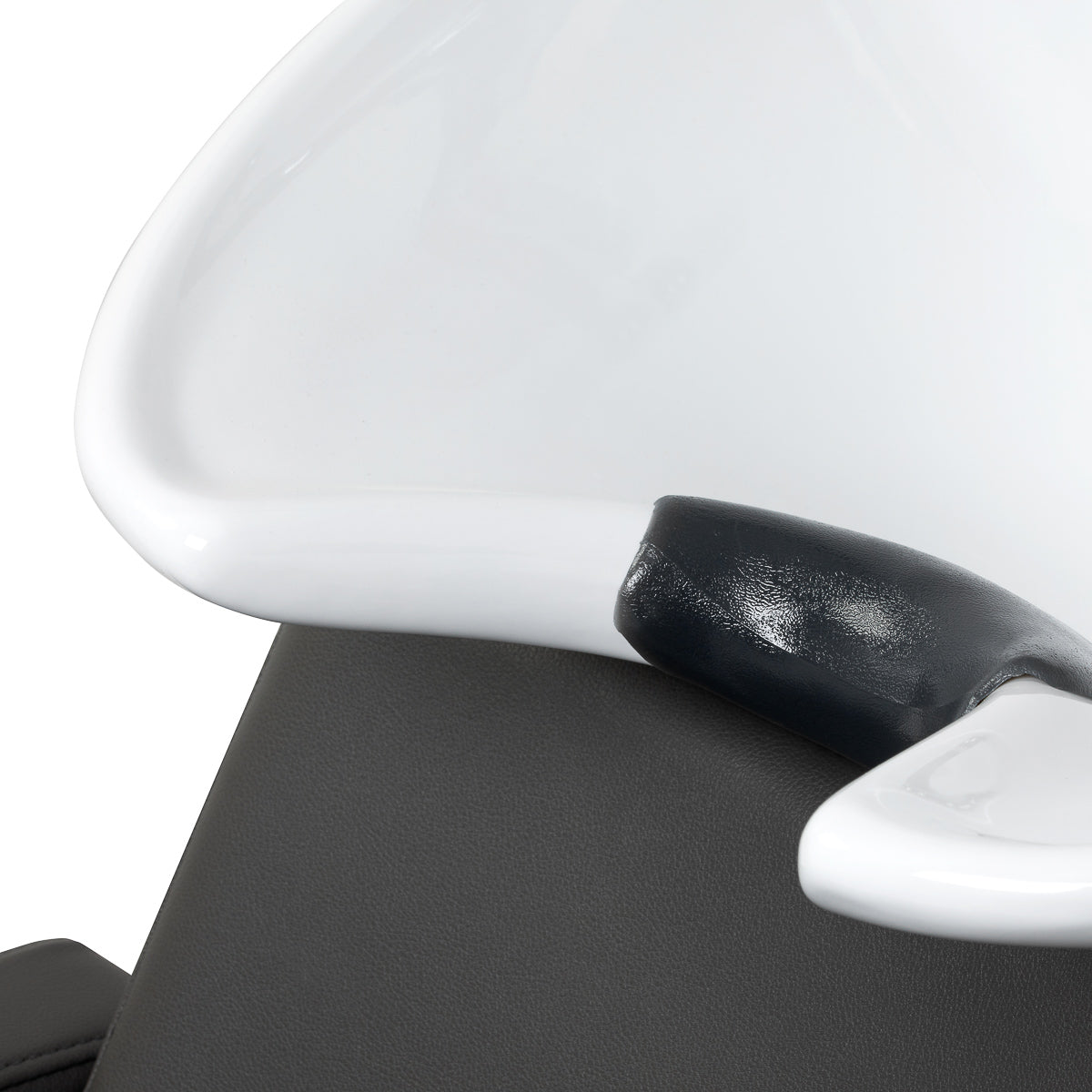El cuenco cerámico profundo en tonos blancos reduce eficazmente las salpicaduras de agua y preparaciones usadas durante los tratamientos. Esto favorece la realización cómoda y precisa de diversos servicios de peluquería. La construcción móvil del cuenco permite un fácil ajuste del ángulo de inclinación según las necesidades individuales. El material utilizado es duradero, resistente a la decoloración y a los arañazos, y fácil de mantener limpio. El collarín adecuadamente perfilado proporciona un soporte cómodo para la cabeza durante el lavado, mientras que la cómoda cubierta de plástico en tonos negros elimina la sensación de frialdad de la superficie cerámica.