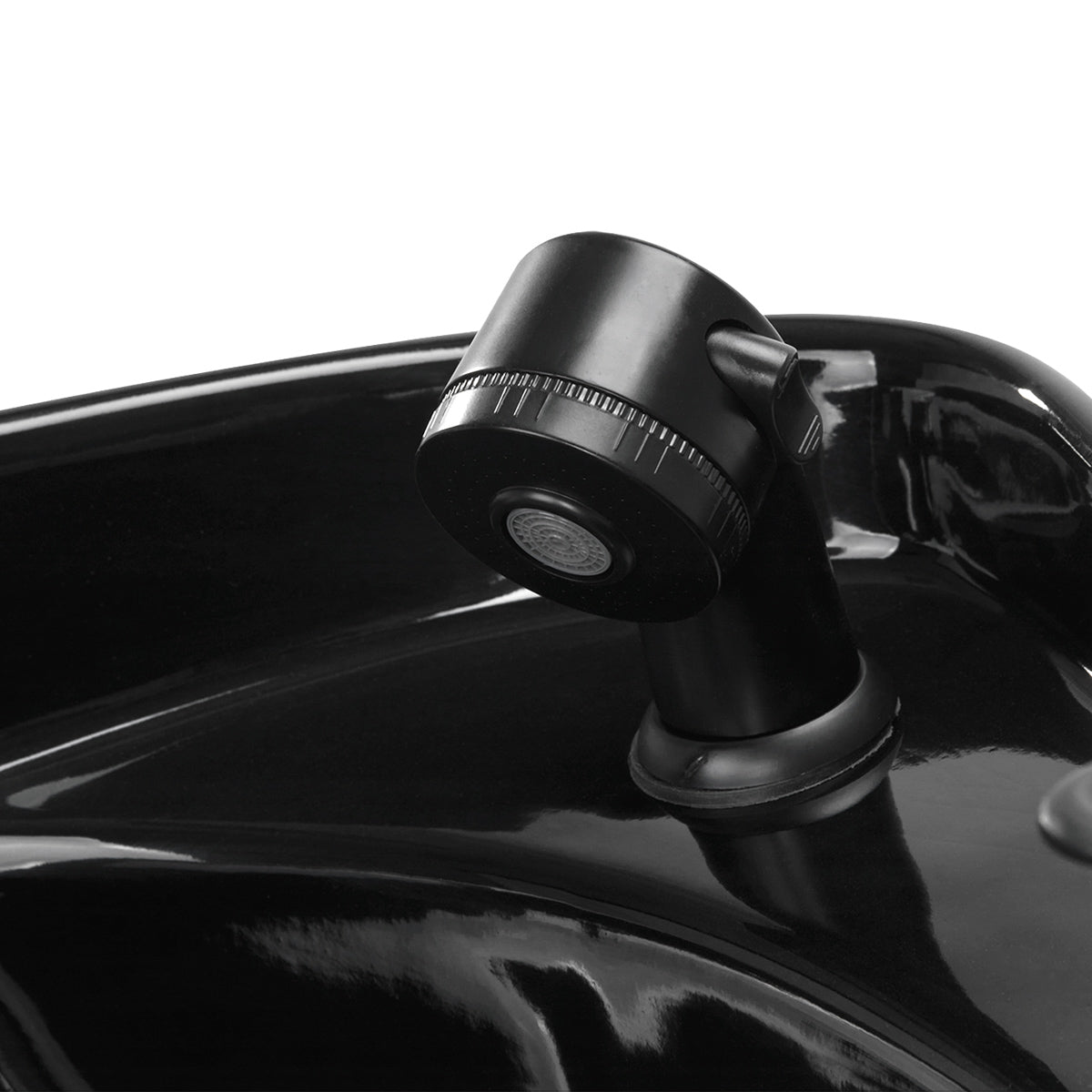 El lavabo cerámico negro con la profundidad adecuada evita salpicaduras excesivas de agua y productos usados durante el tratamiento, permitiendo la realización cómoda de una amplia gama de servicios. La capacidad de ajustar el ángulo del lavabo permite adaptar la configuración a las necesidades individuales. El material utilizado hace que el lavabo sea duradero, resistente a manchas y arañazos, y muy fácil de limpiar. Un collarín correctamente perfilado proporciona soporte y comodidad durante el lavado de cabello, y con la cómoda cubierta de plástico, el cliente no sentirá la incomodidad asociada con la fría superficie cerámica.