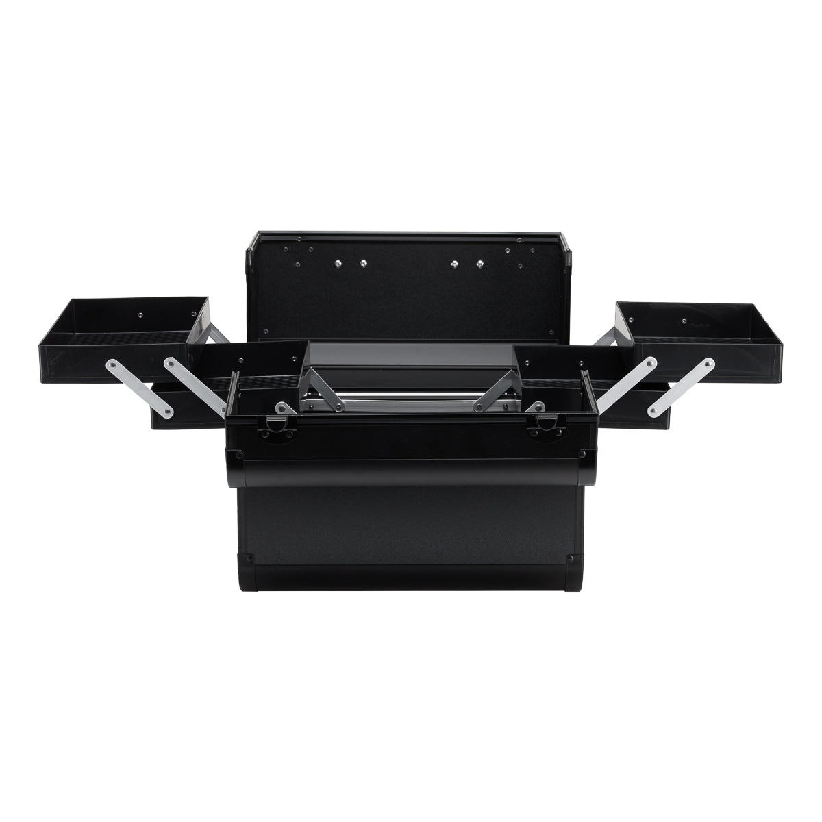 El diseño moderno con paredes lisas de acabado negro y acentos metálicos añade un toque de elegancia. El asa facilita el transporte, lo cual es especialmente importante para estilistas móviles. Fabricado con materiales duraderos y resistentes a daños, asegura comodidad de uso diaria. Un cierre robusto con llave mantiene protegido el contenido, mientras que la estructura ligera y duradera hace que el estuche sea fácil de llevar.