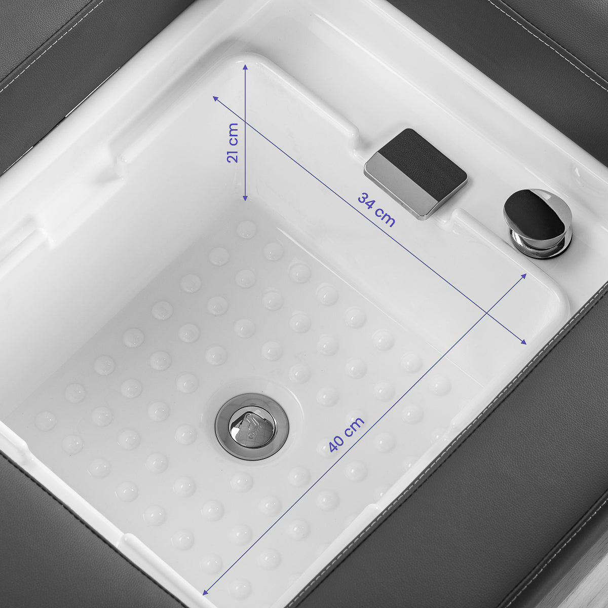 El reposacabezas ajustable con ángulo de inclinación extensible y regulable asegura un ajuste perfecto para el usuario, mejorando la comodidad durante los tratamientos. El conjunto incluye cojines ergonómicos, incluyendo un reposacabezas con apertura facial, que permite no solo tratamientos del cuero cabelludo sino también masajes y una variedad de tratamientos corporales y faciales. La cubeta incorporada amplía la funcionalidad de la camilla, permitiendo tratamientos de cuidado de pies, incluyendo pedicuras. Esta solución mejora aún más la sensación de relajación y permite una gama aún más completa de servicios. Estas características prácticas hacen que la cama sea un equipo versátil para salones de belleza y bienestar, asegurando tanto la comodidad del cliente como la efectividad de los tratamientos realizados.