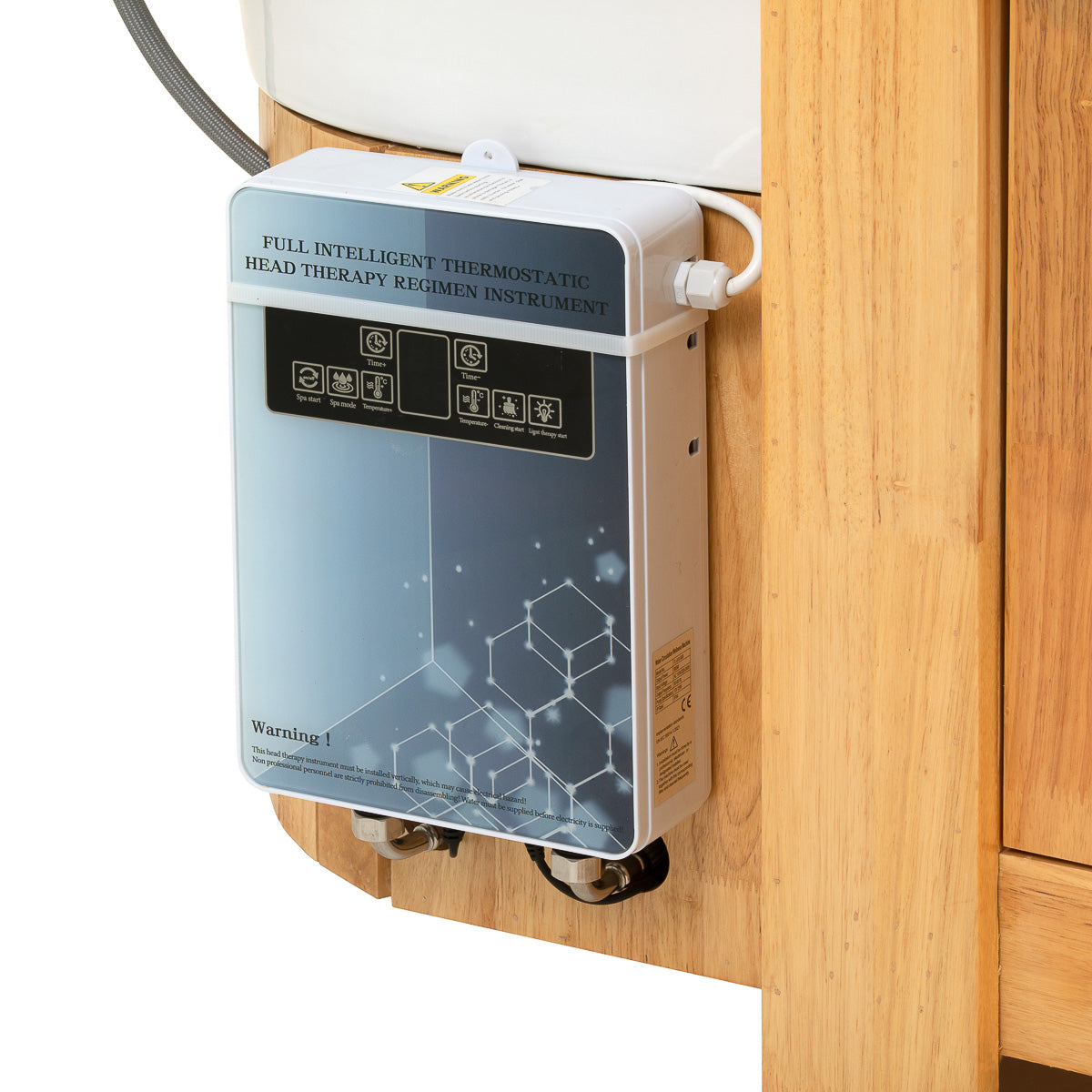 El panel táctil intuitivo permite un control total sobre los parámetros del tratamiento, asegurando facilidad de uso. Permite ajustar el tiempo de funcionamiento y la temperatura del agua, así como monitorear la configuración en tiempo real. El panel también permite activar la terapia de luz: la luz en la cubeta crea una atmósfera relajante y realza la sensación lujosa del tratamiento. Además, el dispositivo de terapia de vapor está equipado con un control remoto para una operación conveniente.