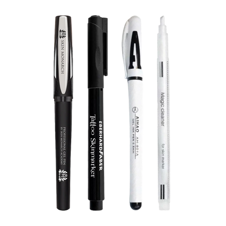 Los marcadores para la piel, como el White Outline Pen y el Skin Monarch Gel Sketch Pen (Negro/Rojo), proporcionan líneas nítidas y visibles que permanecen durante el mapeo y son suaves con la piel. Estos marcadores son perfectos para crear guías precisas que no se emborronan ni se desvanecen durante tu sesión.