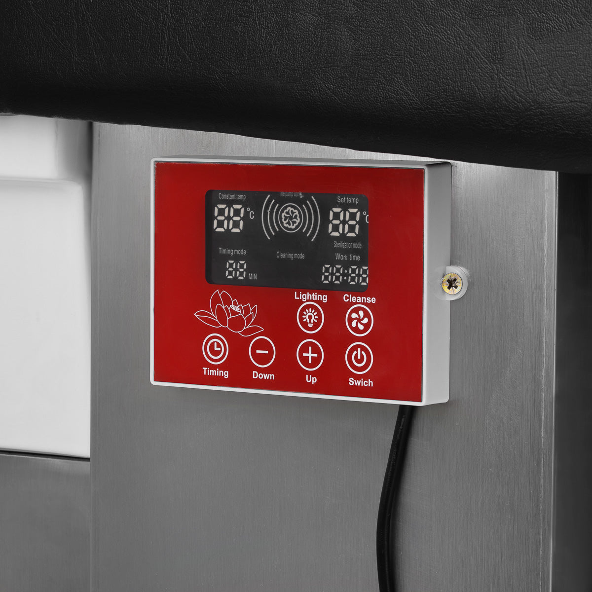 El panel táctil intuitivo proporciona control total sobre las funciones de la unidad de lavado. Permite ajustar el tiempo de funcionamiento y la temperatura del agua, así como monitorear sus valores actuales. Gracias a la pantalla incorporada, se puede verificar en cualquier momento cuánto tiempo ha estado funcionando el dispositivo. El panel también permite la activación de la función de terapia de luz, es decir, la iluminación del lavabo, creando una atmósfera de relajación y lujo. Además, el dispositivo de terapia de vapor está equipado con un control remoto, que permite una operación remota cómoda.