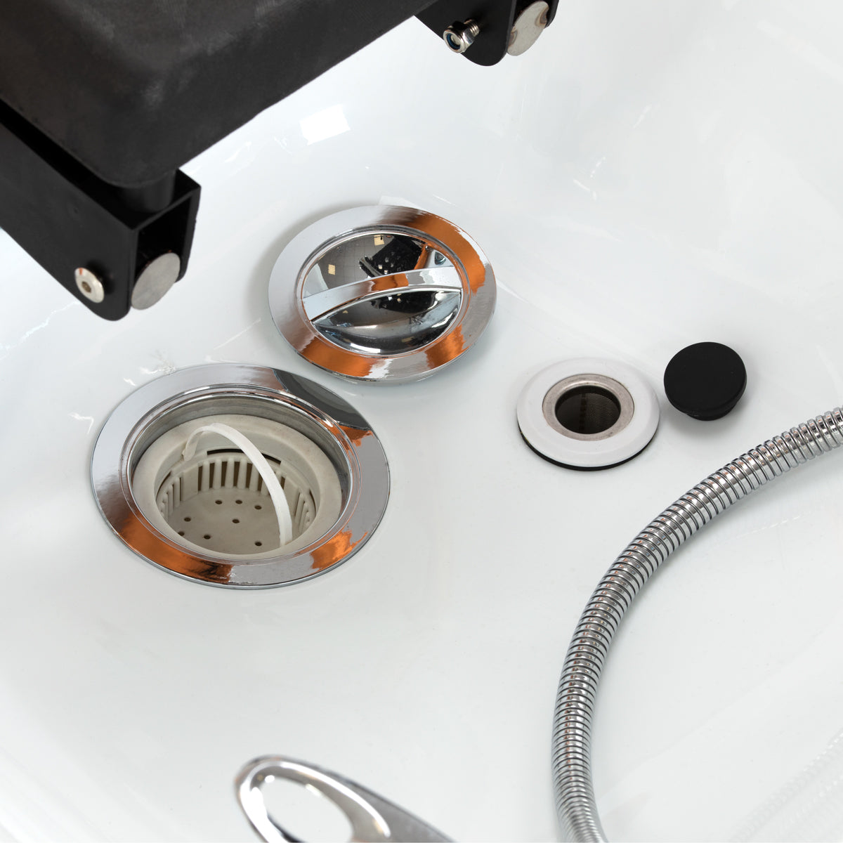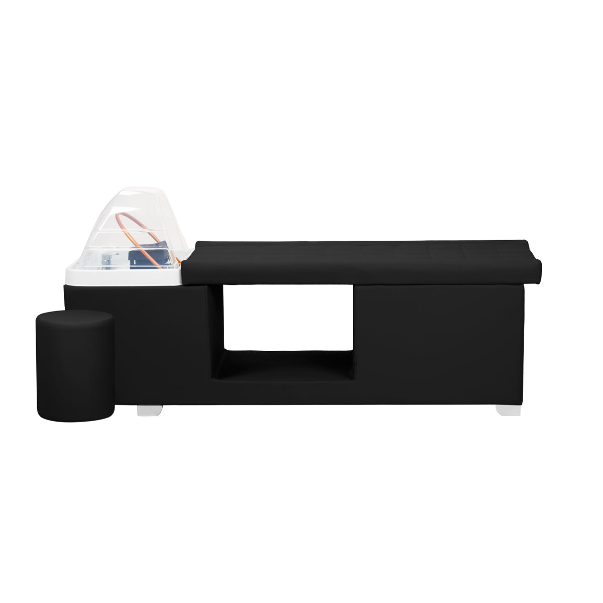 La unidad de lavado está equipada con un grifo mezclador, que permite ajustar con precisión la temperatura del agua según las necesidades del cliente. Un espacio dedicado para la ducha mejora la eficiencia, mientras que un tapón cromado con un colador especial asegura el control del flujo de agua y mantiene un alto nivel de higiene. La conexión de agua está ubicada dentro de la base, detrás de la tela, ocultando estéticamente la fontanería y dando a toda la unidad un aspecto elegante. La cama con contornos ergonómicos asegura comodidad durante diversos tratamientos de belleza. Un puf práctico complementa la unidad, aumentando la comodidad del personal y mejorando la funcionalidad del conjunto. Estas características hacen que la unidad de lavado sea ideal tanto para salones de peluquería como de SPA.