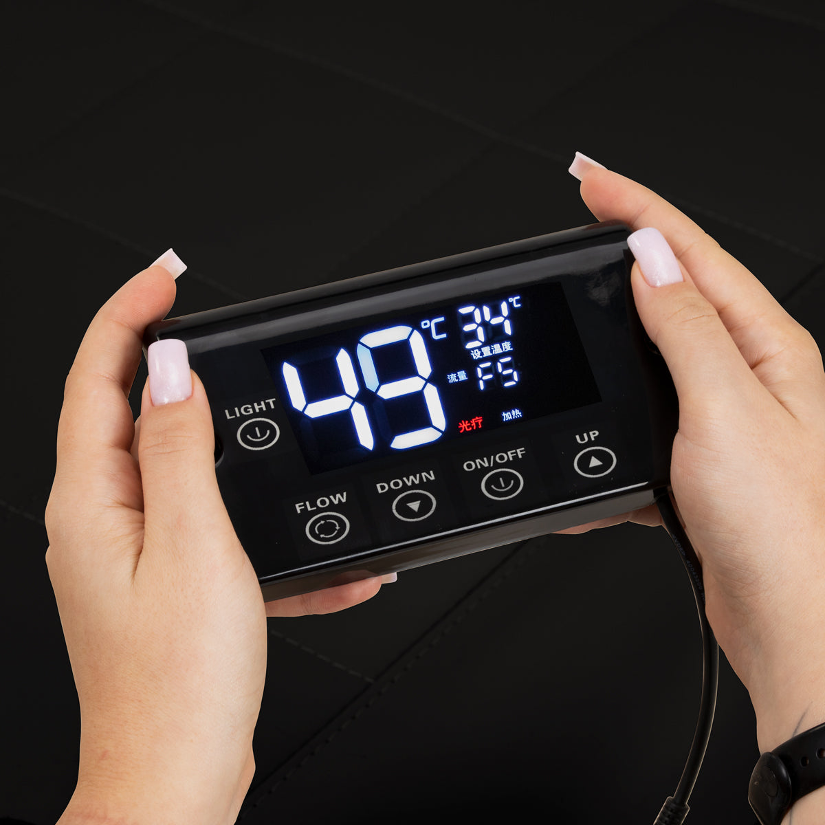 El panel táctil intuitivo permite un control total sobre los parámetros del tratamiento y facilita su uso. Permite ajustar el tiempo de funcionamiento y la temperatura del agua, así como supervisar sus valores actuales en una pantalla clara y fácil de leer. Además, el panel permite activar la función de fototerapia, que ilumina la cubeta, creando una atmósfera de relajación y lujo. El conjunto también incluye un mando a distancia, que permite controlar cómodamente el dispositivo de terapia de vapor a distancia.
