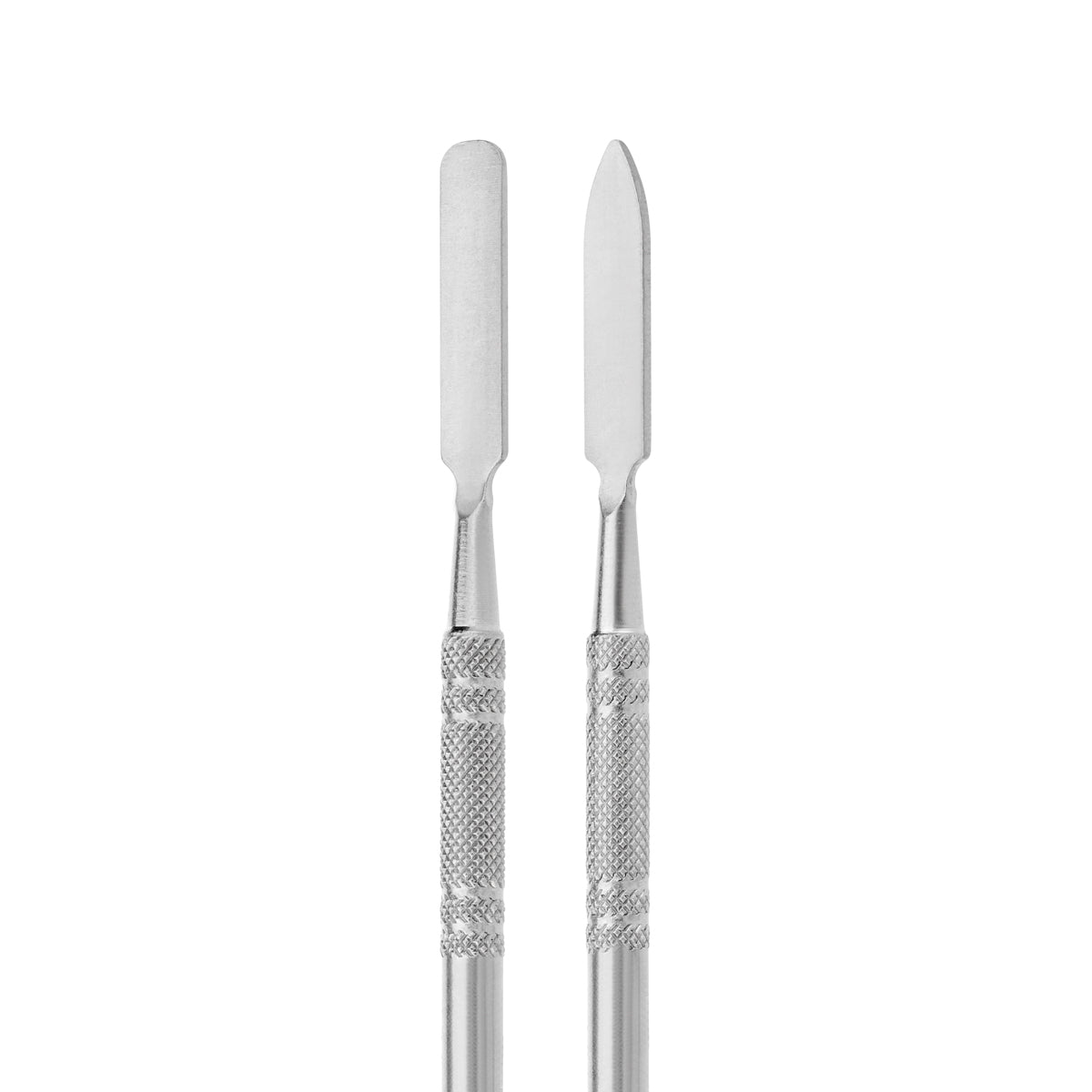 El set también incluye una baguette de doble cara con acabado semi mate, que facilita la mezcla de productos. La herramienta tiene dos puntas funcionales con diferentes formas, usadas según sea necesario. El instrumento se adapta perfectamente a la mano, y gracias al elegante estriado en el mango, no se resbala en la mano, haciendo el trabajo mucho más fácil.