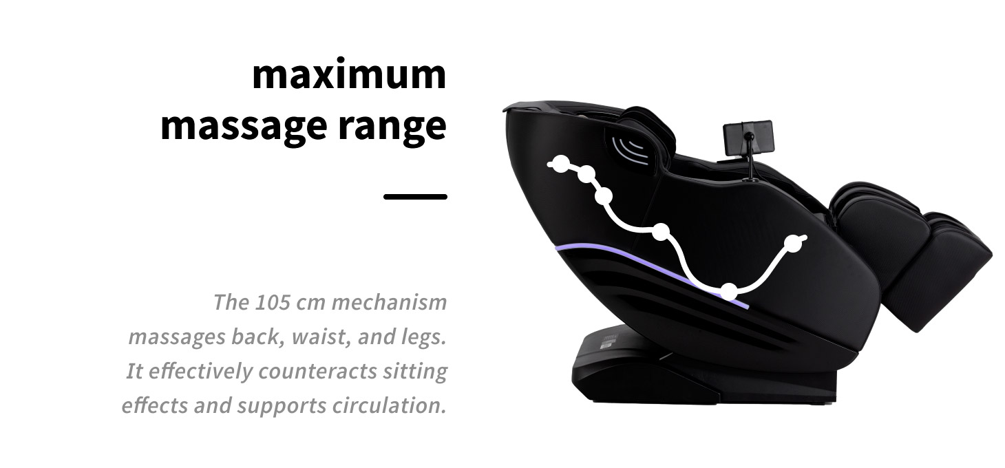 The roller massage path in the Maximus 809 model covers a length of 105 centimetres – from the neck to the upper legs. The range of action covers the entire back, including the thoracic and lumbar spine, as well as the waist, hips, buttocks and thighs. Such an extensive massage path allows for even and comprehensive treatment of both the upper and lower parts of the body, ensuring deep muscle relaxation and a significant improvement in comfort. The massage supports blood circulation, helps to reduce muscle tension and promotes regeneration of the body after prolonged sitting, an intense day at work or physical exertion.