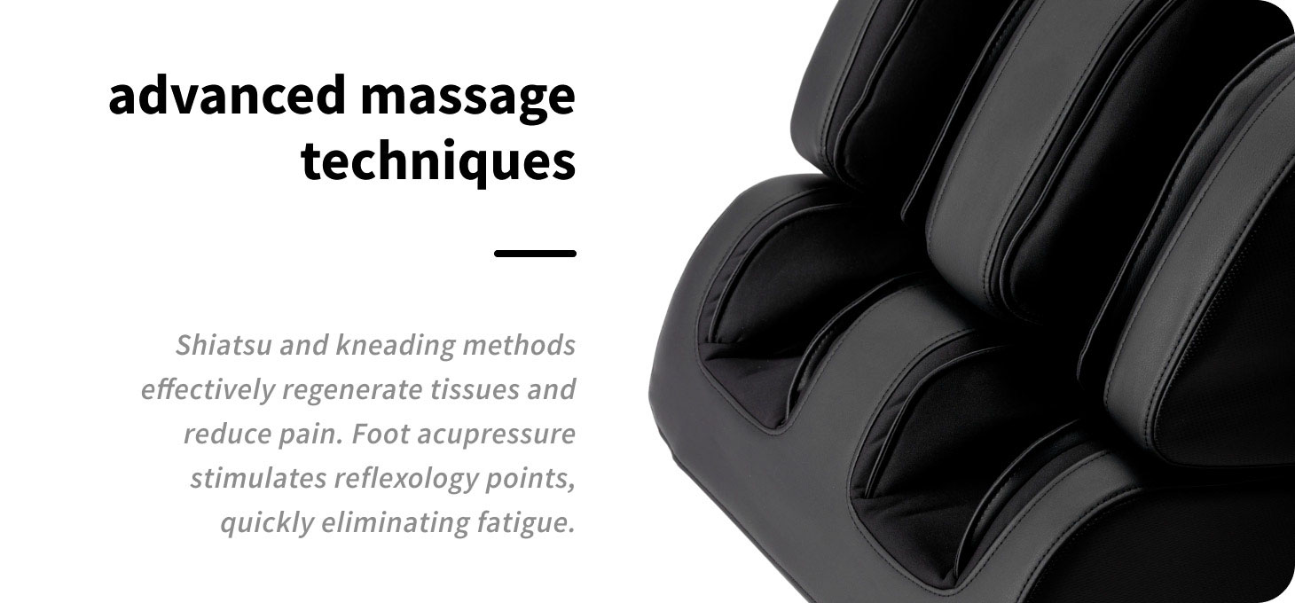 The massage technologies used are based on precisely selected and complementary techniques such as kneading, knocking, tapping and shiatsu. Their various combinations allow for effective muscle tissue treatment, supporting the body's natural regenerative processes and helping to reduce tension and pain. In addition, the built-in foot massager uses acupressure techniques to target key reflexology points. Precise pressure promotes deep relaxation and effectively reduces foot fatigue.