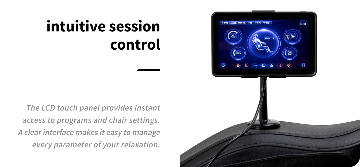 The control panel allows you to easily adjust the massage to your individual needs. For greater convenience, it can be placed in the holder on the right armrest or held in your hands. The screen clearly displays all key information – the body parts currently being massaged, the intensity of the massage, the duration of the session and the selected programme. The panel allows you to switch between automatic and manual modesand activate voice control, increasing the comfort of use. It can be used to conveniently select from the available massage modes, adjust the intensity, adjust the chair settings and precisely adjust the session time in 5-minute intervals (5, 10, 15, 20, 25 or 30 minutes), ensuring the ideal massage length tailored to the user's needs.