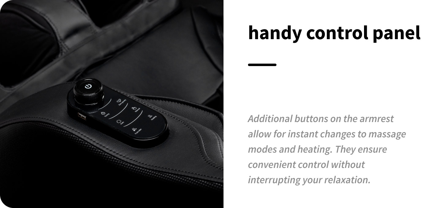 For added convenience, the chair is equipped with an additional set of control buttons located on the left armrest. The built-in handy remote control provides quick access to the most important functions without having to reach for the main panel. This allows the user to easily change the type of massage, start a foot massage, activate the heating function and the Zero Gravity function, allowing full control over comfort and intensity of relaxation at any time.