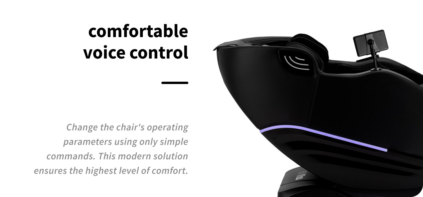 The massage chair is equipped with a voice control function for convenient hands-free operation. With simple commands, you can start or end a massage, select a mode, and adjust the airbags and massage intensity. This solution increases comfort, allows for complete relaxation, and lets you focus entirely on unwinding without having to reach for the control panel.