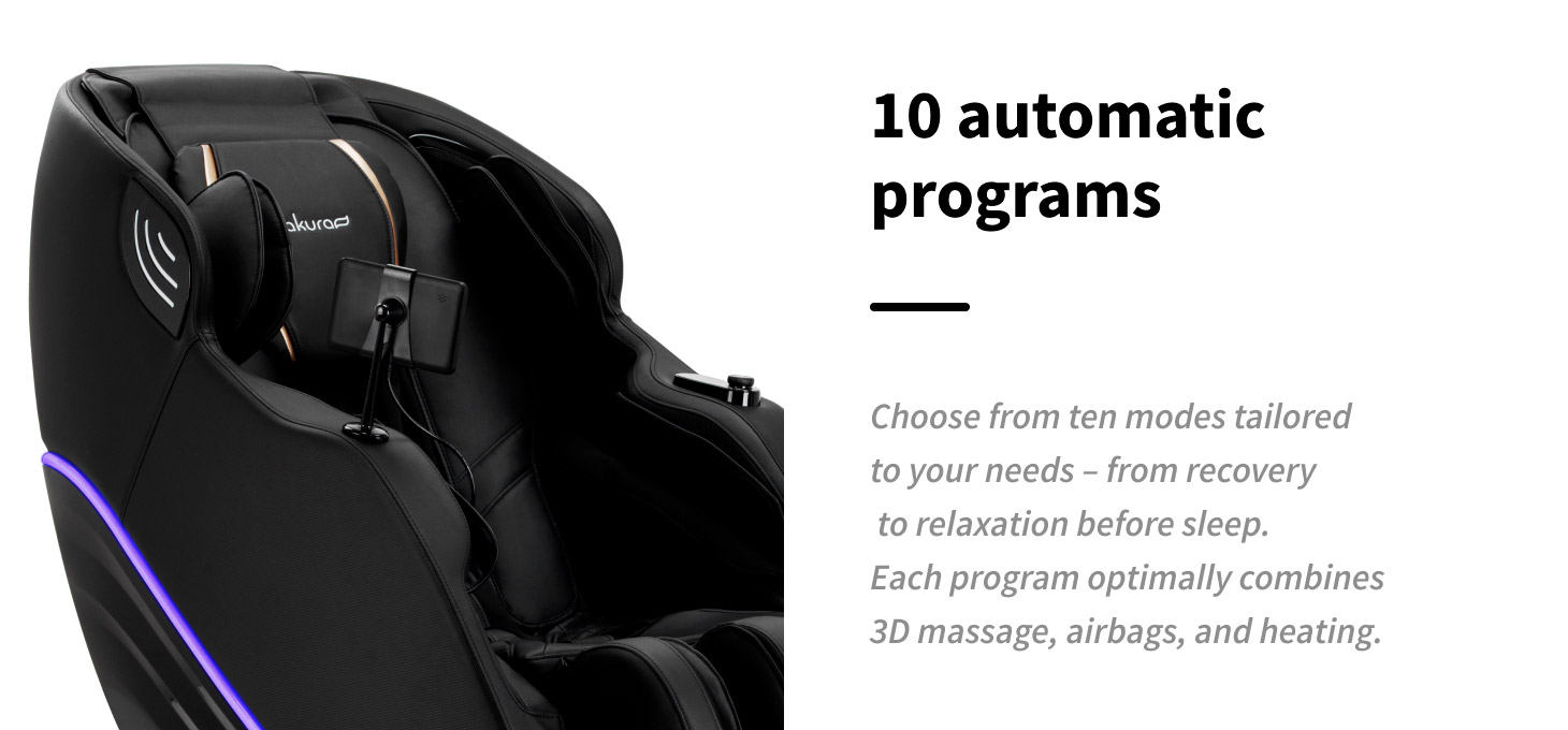 The Sakura Maximus 809 massage chair with advanced 3D massage provides comprehensive relaxation and high comfort of use. Its well-thought-out functions are responsible for an intense, relaxing massage. The intelligent body detection system, 3D technology, precision massage heads and air cushion system are responsible for effective muscle relaxation, deep relaxation and calmness. The perfect solution for both active people and those who spend many hours in a sitting position, offering a daily dose of relaxation at the highest level. Regular massage sessions support circulation, help reduce muscle tension and fatigue, and effectively lower stress levels, positively affecting your daily well-being and quality of life.