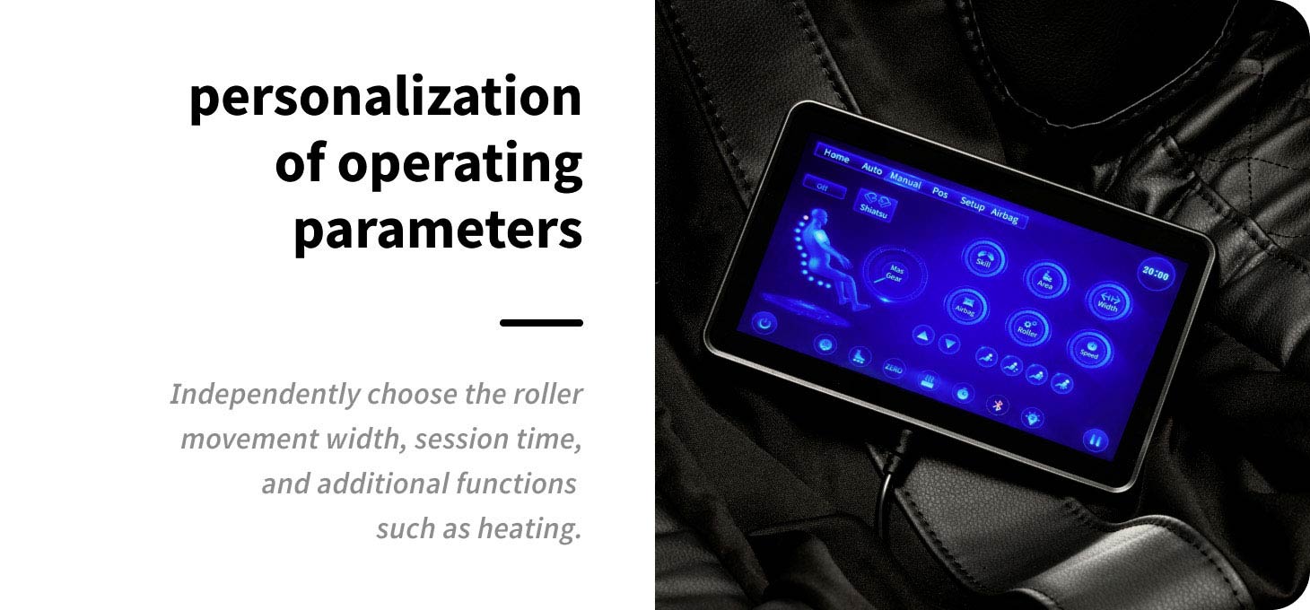 Automatic body scanning precisely adjusts the massage to the individual parameters of the user. Recognition of height, shoulder position and body type allows the massage rollers to be adjusted, resulting in an optimally tailored massage and greater effectiveness. During the scanning process, the rollers move up and down, and the ability to adjust the settings from the control panel allows for additional customisation of the massage to personal preferences, increasing the comfort and effectiveness of each session.