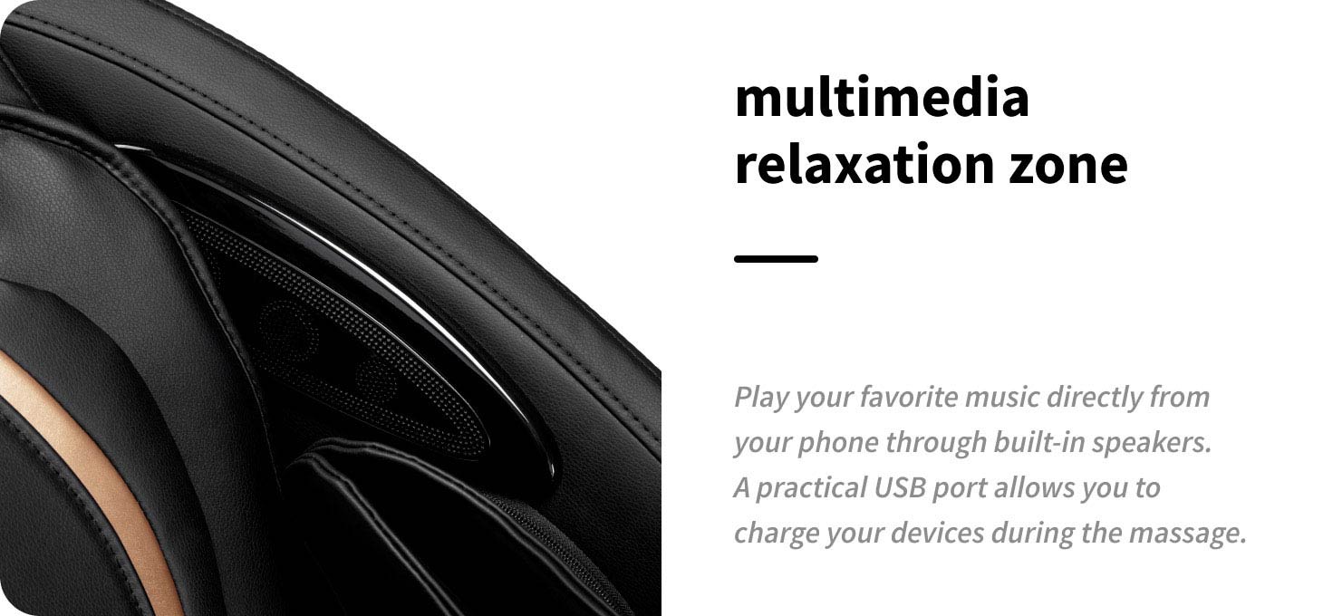 For added comfort and relaxation, the massage chair can be connected to your phone via Bluetooth, allowing you to play your favourite relaxing music during your session. Calm sounds help to calm the mind, improve your mood and allow your body to fully relax. In addition, the chair is equipped with a USB port, allowing you to charge your mobile devices during the massage.