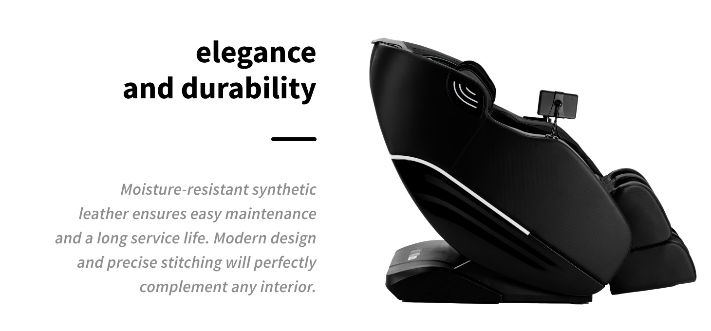 The chair is equipped with a back and calf heating system that helps to relax tense muscles, increasing the pleasure and effectiveness of the massage. Mechanical adjustment of the footrest extension allows the chair to be perfectly adjusted to the user's height, ensuring a comfortable and ergonomic position during each session. In addition, the model has been enhanced with illuminated side elements that give it a modern and elegant character, creating a pleasant, relaxing atmosphere and serving as a decorative element that enriches the interior design.