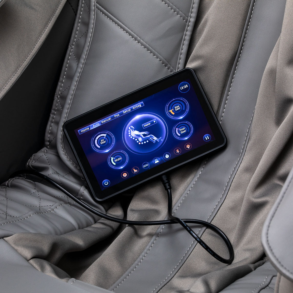 The control panel allows you to easily adjust the massage to your individual needs. For greater convenience, it can be placed in the holder on the right armrest or held in your hands. The screen clearly displays all key information – the body parts currently being massaged, the intensity of the massage, the duration of the session and the selected programme. The panel allows you to switch between automatic and manual modesand activate voice control, increasing the comfort of use. It can be used to conveniently select from the available massage modes, adjust the intensity, adjust the chair settings and precisely adjust the session time in 5-minute intervals (5, 10, 15, 20, 25 or 30 minutes), ensuring the ideal massage length tailored to the user's needs.