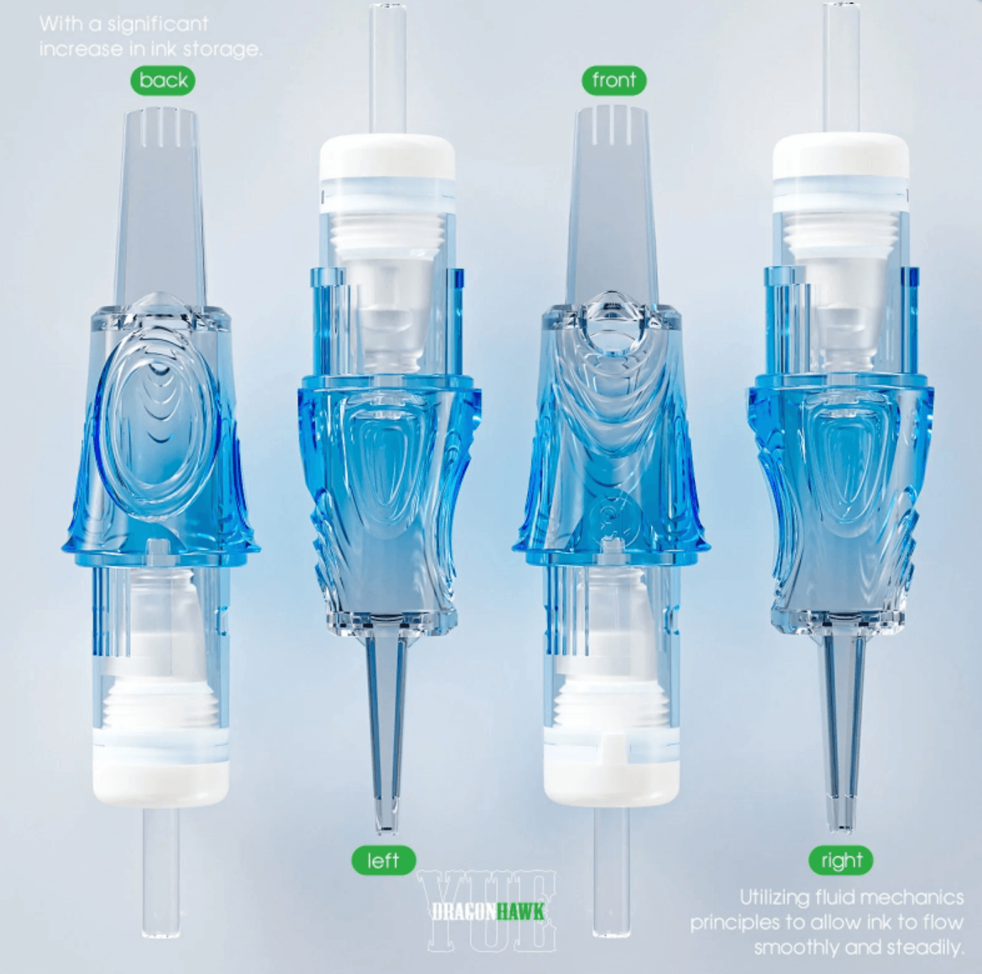 - Líneas Fluídas Ergonómicas: Inspiradas en la belleza del agua ondulante, las líneas fluídas del cartucho mejoran la comodidad del agarre, asegurando facilidad de uso durante largas sesiones de tatuaje. Este diseño ergonómico permite a los artistas mantener el control sin comprometer la comodidad.