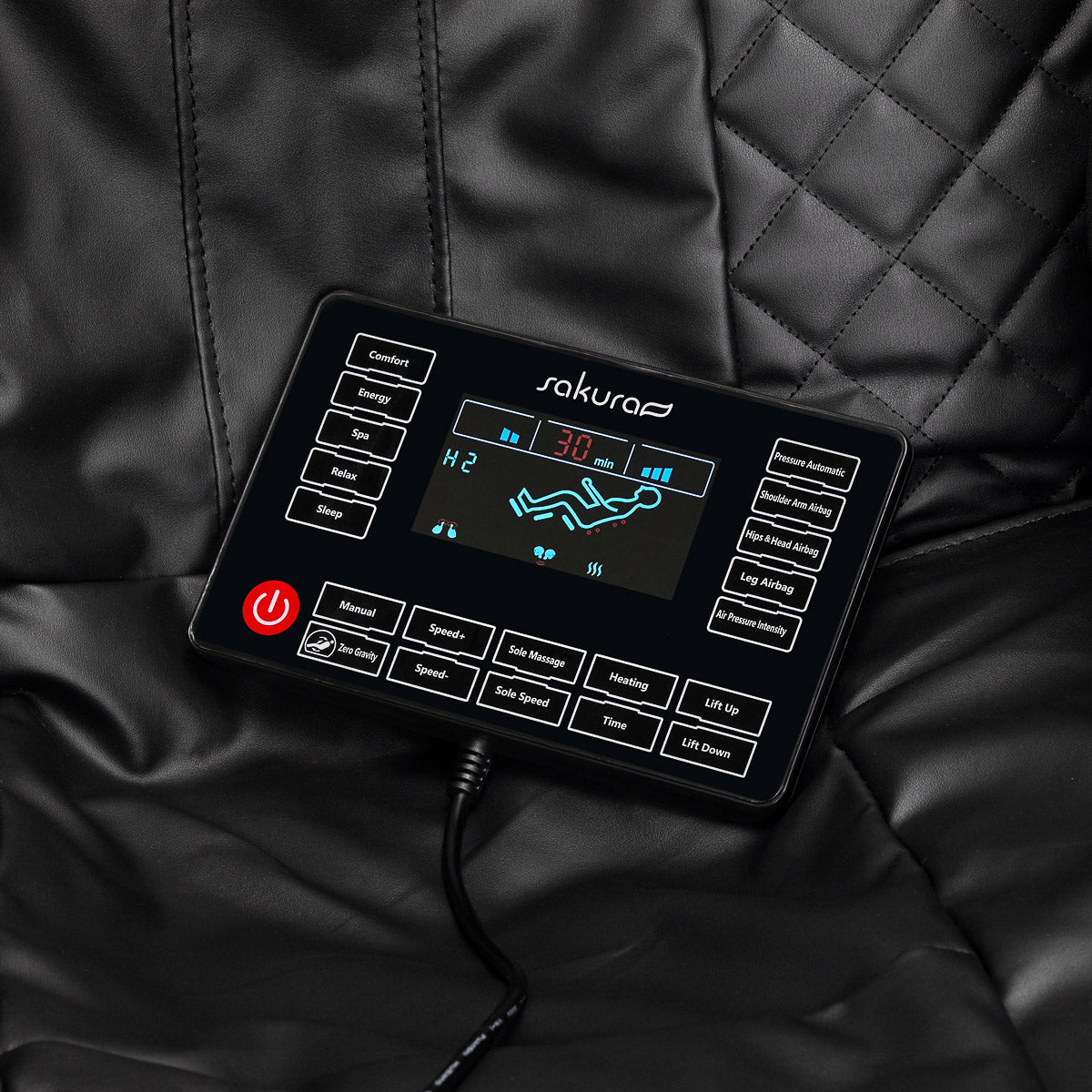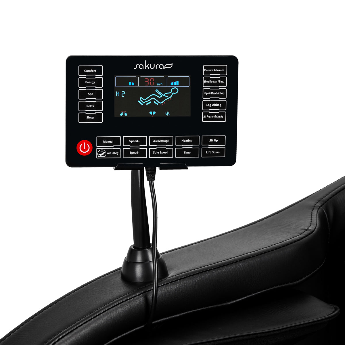 Con el panel de control transparente – que puede colocarse en el mango montado en el reposabrazos derecho o sostenerse en las manos – usar la silla es simple y agradable. Puede seguir el funcionamiento del dispositivo en la pantalla LCD clara. Las áreas del cuerpo que se están masajeando actualmente, la intensidad del tratamiento, el tiempo de servicio y el programa seleccionado se muestran claramente. El panel permite ajustar libremente la configuración de la silla y las funciones de masaje, así como establecer la duración del tratamiento, que puede durar 5, 10, 15, 20, 25 o 30 minutos.