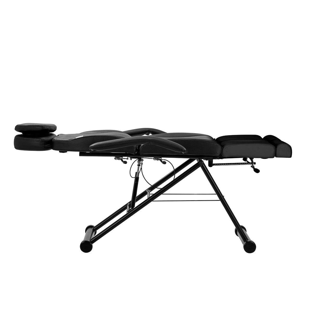La base de la silla tiene una altura fija, por lo que el asiento está a un nivel constante, lo que debería garantizar comodidad durante el uso. El sólido marco metálico en tonos negros proporciona la estabilidad necesaria durante el uso. El reposacabezas, que se extiende aproximadamente 15 cm, ofrece excelente soporte para la cabeza, independientemente de la altura del cliente. Esto permite realizar libremente varios tipos de tratamientos, incluyendo cosmetología, fisioterapia y tatuajes.