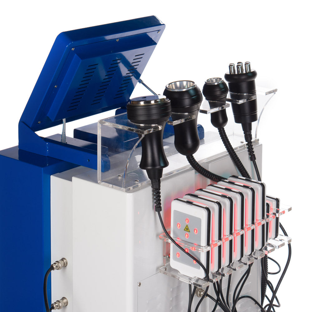 Aparato profesional BeautySystem, BR-059 diseñado para tratamientos que ayudan a la pérdida de peso. Dispositivo equipado con 8 pads de lipoláser, una cabeza para Radiofrecuencia - Ondas de radio, una para Cavitación ultrasónica 40kHz y dos para masaje de vacío - liposucción.