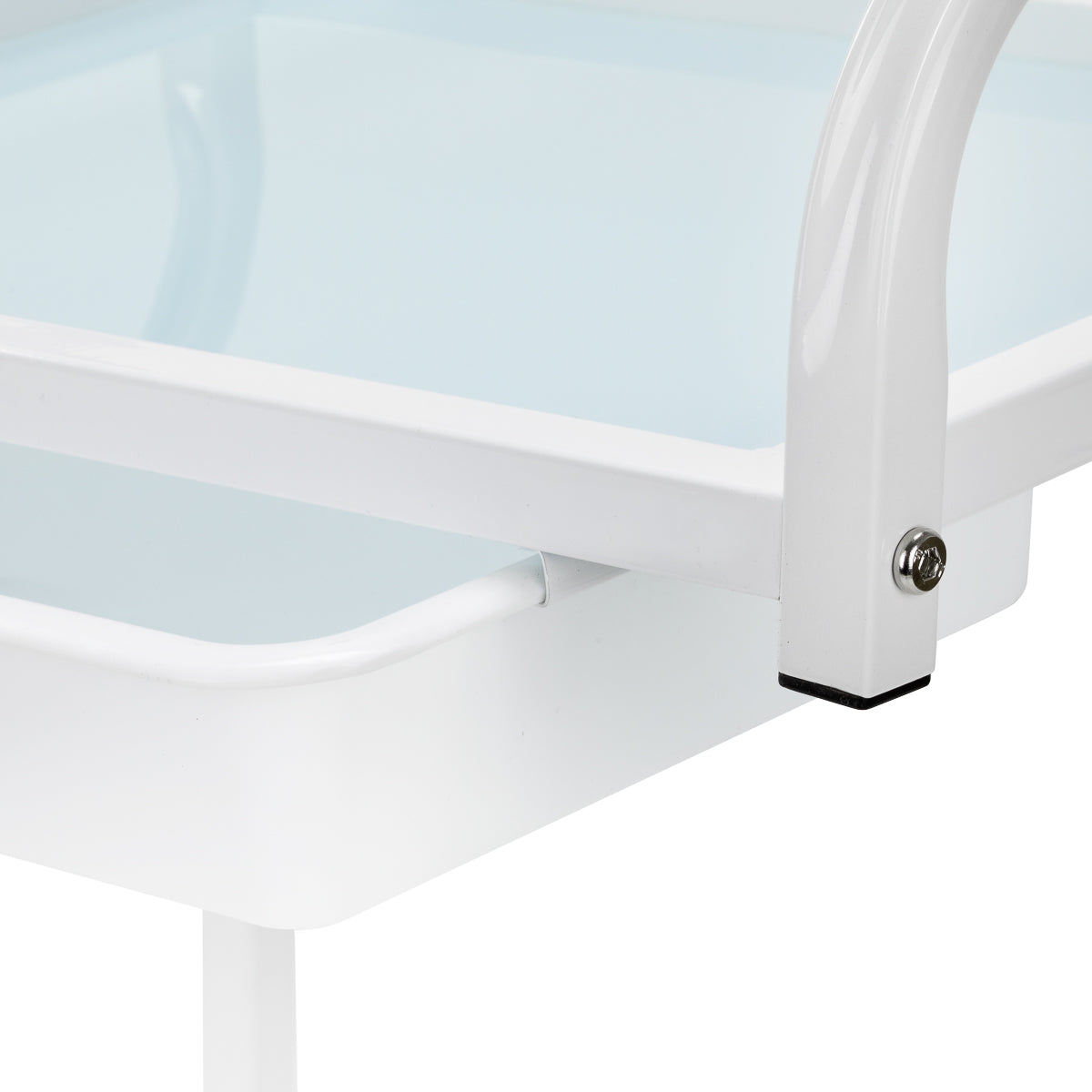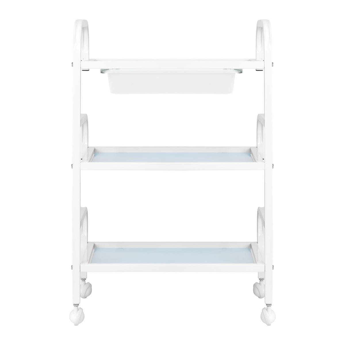 El armazón hecho de aluminio resistente en tonos blancos y los estantes de vidrio crean un conjunto moderno y estético que es fácil de mantener limpio. Cuatro ruedas aseguran movilidad para una fácil organización del espacio de trabajo, mientras que materiales sólidos garantizan estabilidad y durabilidad en el uso.