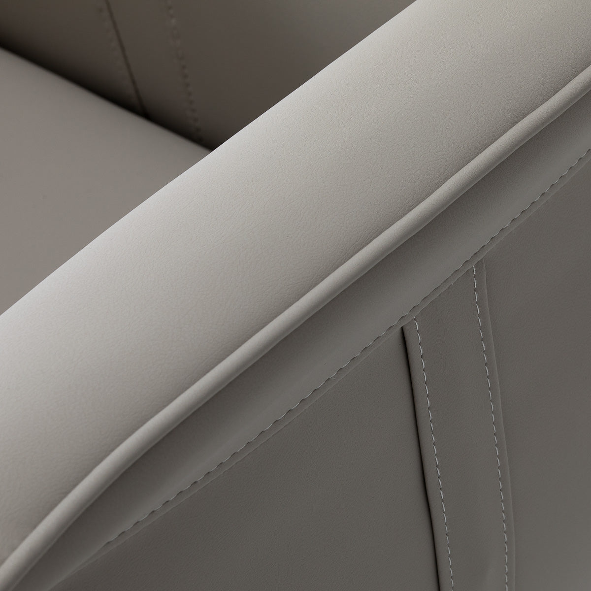 Una base redonda estable con acabado metálico asegura un soporte fiable y seguridad en el uso. El asiento, respaldo y reposapiés están rellenos con espuma resistente a la deformación y tapizados con cuero sintético gris, agradable al tacto, asegurando durabilidad y alto confort de uso. Los materiales utilizados son resistentes a la humedad y fáciles de limpiar, haciendo que la silla sea ideal para el uso diario. Los colores sobrios y la forma clásica permiten que se integre con la decoración de barberías modernas y tradicionales.