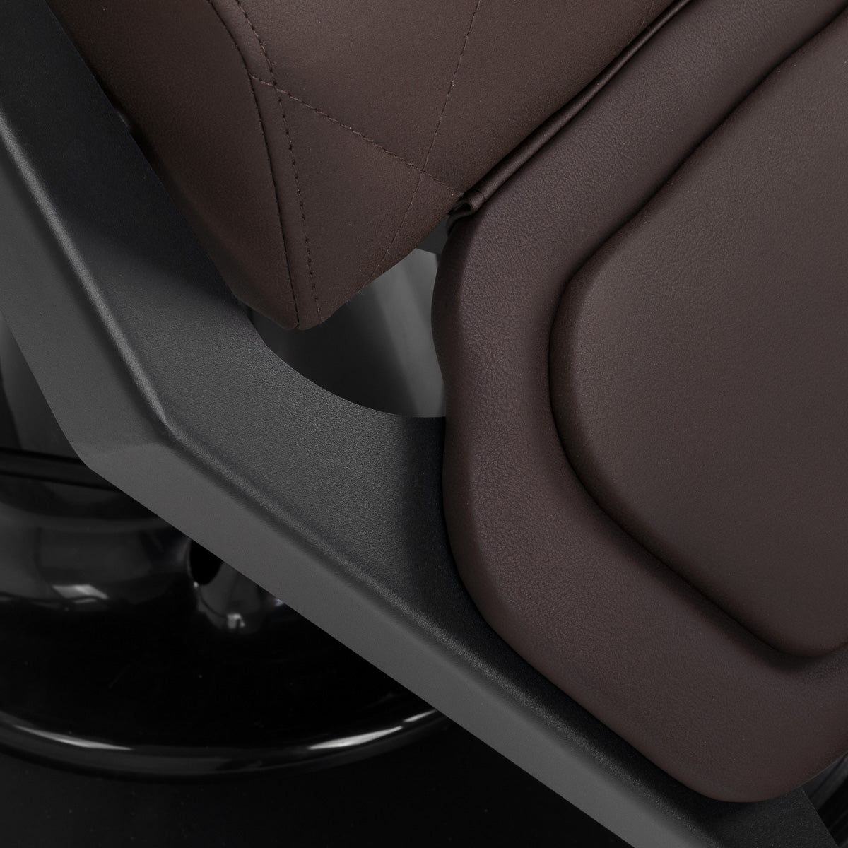El diseño ergonómico del asiento y el respaldo cuidadosamente perfilado garantizan la comodidad del cliente incluso durante tratamientos prolongados. Los reposabrazos tapizados montados a la altura óptima permiten una correcta posición del brazo del cliente, previniendo tensiones en el cuello y la zona de los hombros. El mecanismo de rotación completa aumenta la flexibilidad de trabajo y permite ajustar fácilmente la silla a cualquier posición.