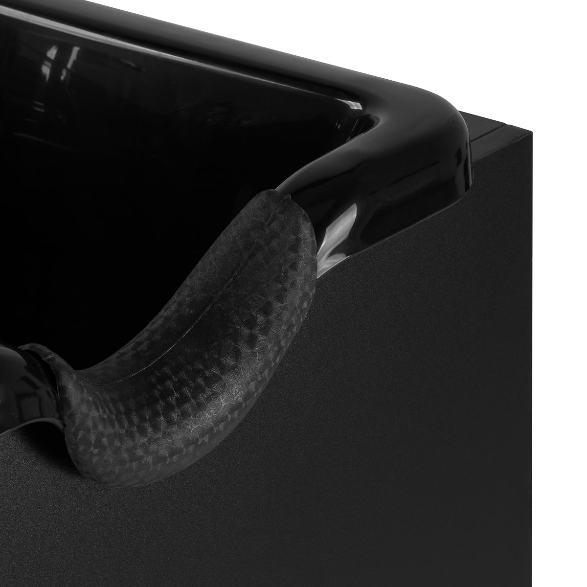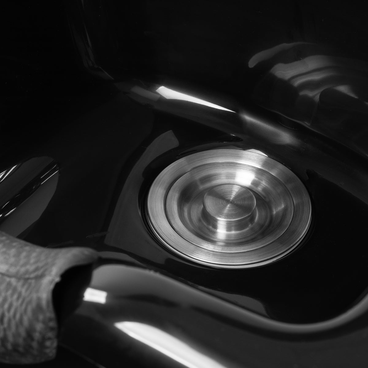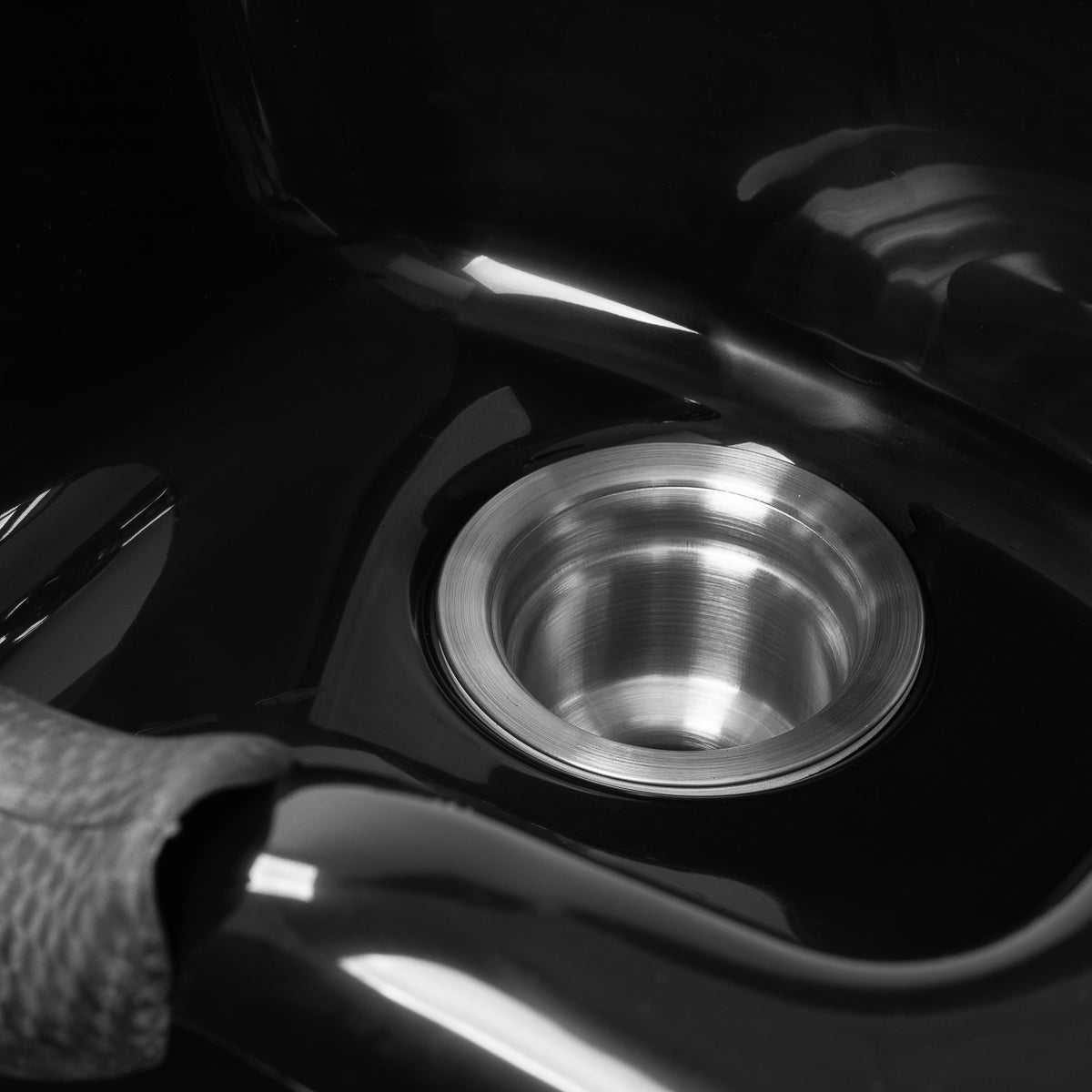 La cuenca negra profunda está hecha de plástico duradero, lo que la hace resistente a daños y fácil de mantener limpia. Su diseño bien pensado reduce eficazmente el salpicado de agua y productos durante el lavado. La forma ergonómica y el cuello perfilado con cubierta de silicona proporcionan al cliente una posición cómoda para la cabeza. Un lugar práctico para el mango de la ducha ayuda a organizar mejor la estación, y el tapón con colador facilita el control del flujo de agua y mantiene la limpieza e higiene.