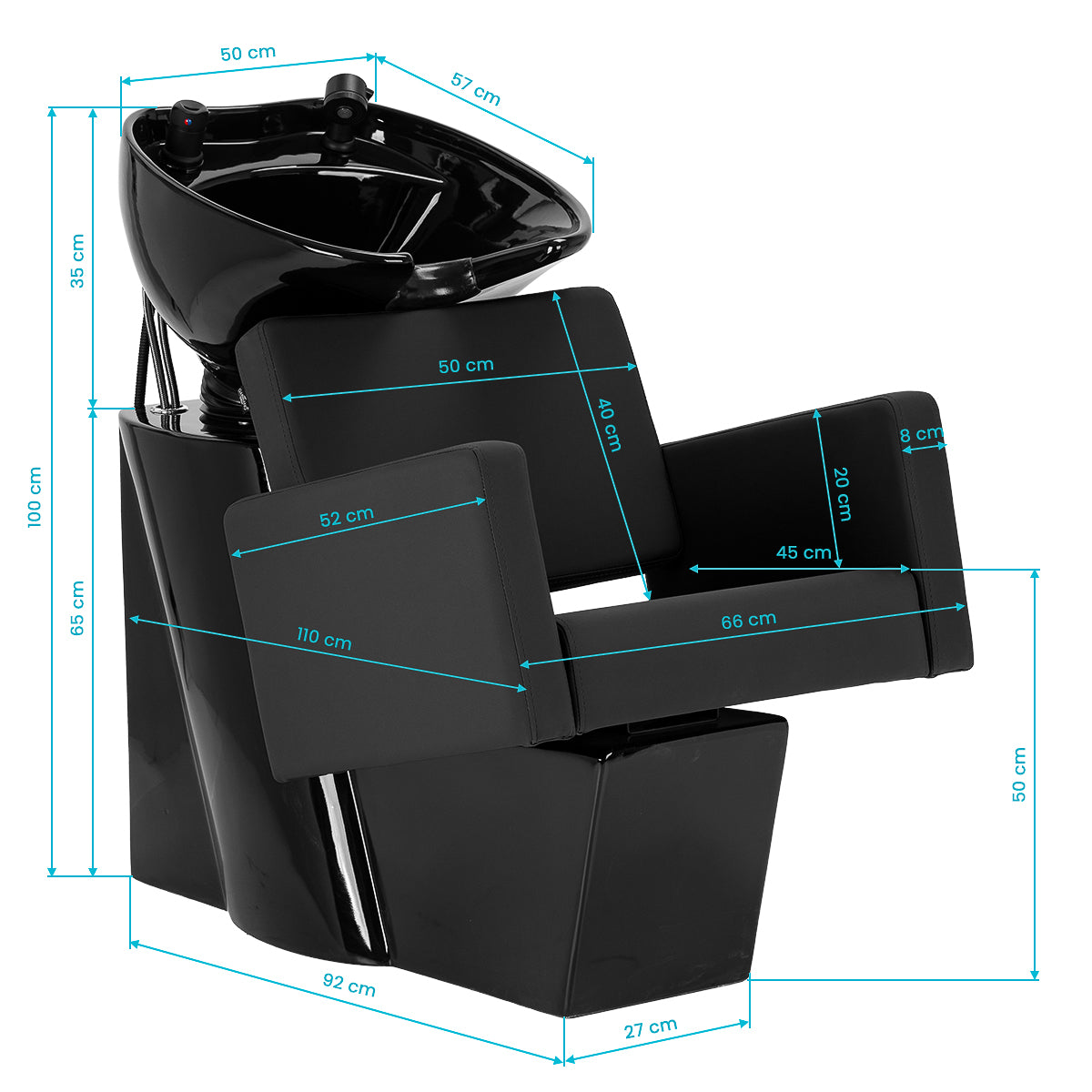 La silla de forma geométrica combina simplicidad moderna con comodidad de uso. El asiento y los reposabrazos con ángulos suaves crean un conjunto armonioso, asegurando una posición cómoda durante los tratamientos, mientras que el respaldo con un ángulo de inclinación óptimo favorece la postura correcta y la relajación. El tapizado de cuero sintético de alta calidad en tonos negros es resistente al uso y a la humedad, además de fácil de limpiar. La forma sencilla y moderna del mobiliario resalta el carácter elegante del lavacabezas, y los accesorios completos – grifo, ducha y mangueras dedicadas – proporcionan un conjunto completo de herramientas para el trabajo.