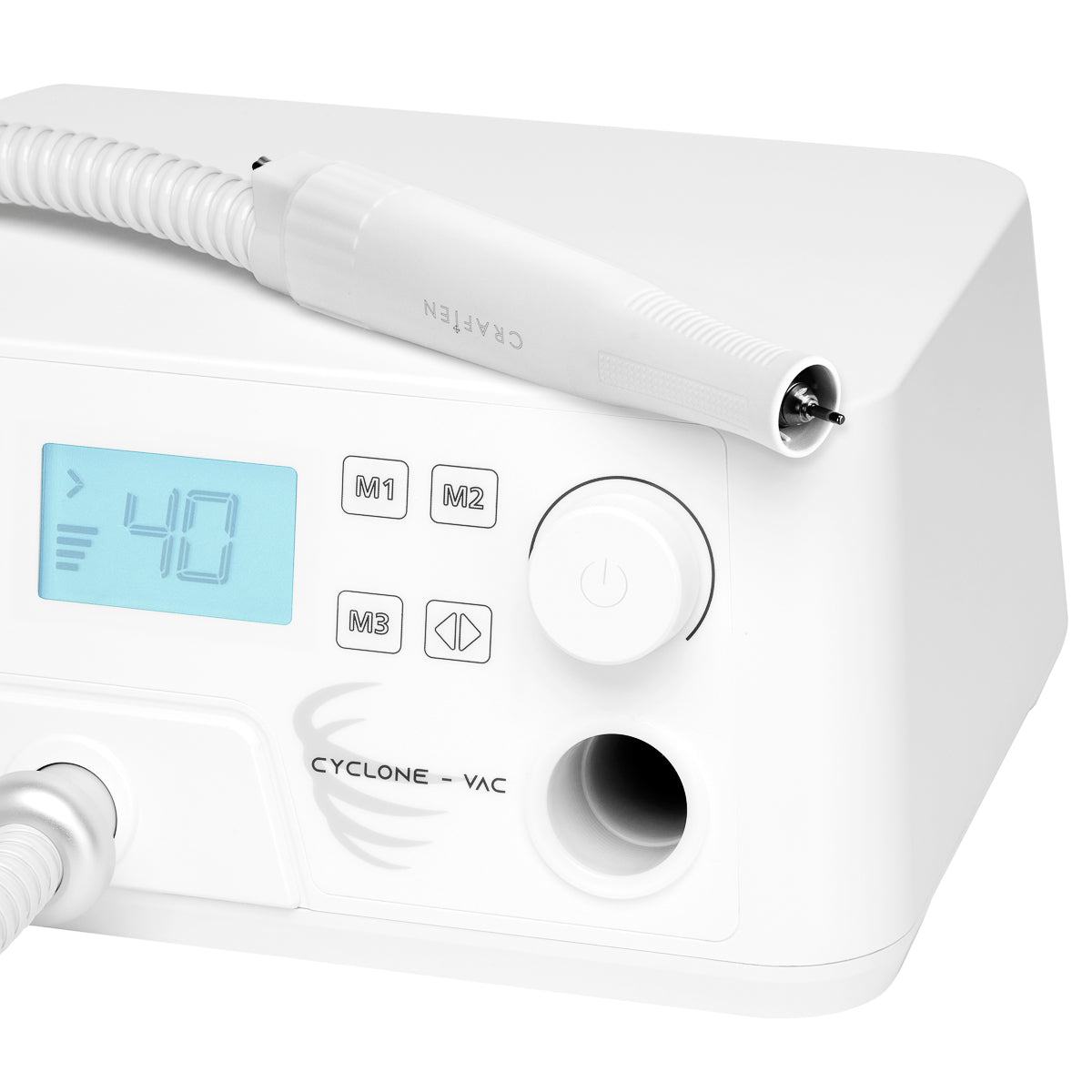 Diseño estético y futurista en tonos blancos que encajará perfectamente en cualquier interior. Un lugar especial para dejar el cabezal permite un trabajo mucho más cómodo, y pies antideslizantes aseguran la estabilidad del dispositivo durante su uso. La máquina de taladro para uñas Saeyang Cyclone-Vac con absorbedor cuenta con una garantía de 12 meses.