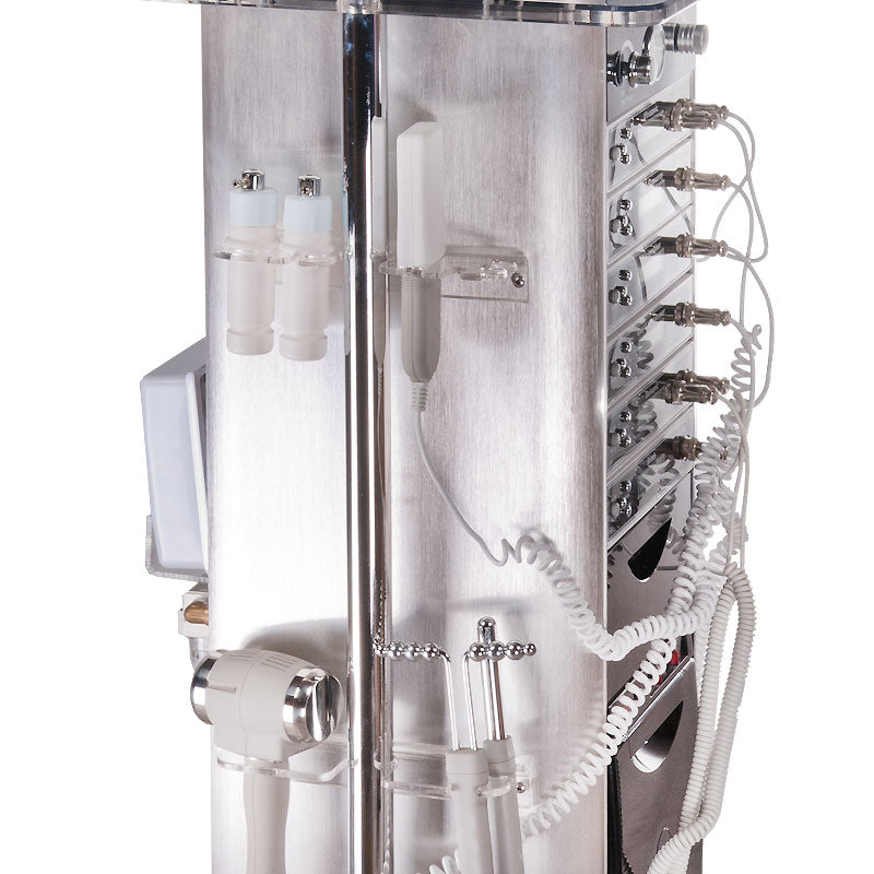 6. D'arsonval / Alta Frecuencia / electroterapia - permite realizar electromasajes utilizando las llamadas corrientes de d'Arsonval. El chisporroteo que ocurre al contacto del electrodo de vidrio con la piel tiene un efecto estimulante efecto sobre la piel y los tejidos subcutáneos, músculos y, de forma indirecta, sobre los órganos internos. El ozono generado durante el tratamiento tiene acción bactericida. Las cargas eléctricas causan la dilatación de los vasos sanguíneos de la piel, aceleran el metabolismo, aumentan la absorción de sustancias nutritivas y medicinales contenidas en los preparados cosméticos.