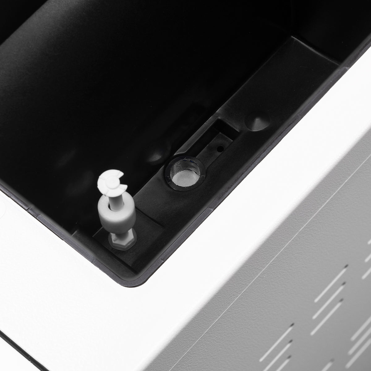 | Tanques incorporados para agua limpia y usada | El tanque de agua limpia está destinado para agua destilada o desionizada para la esterilización. La presencia de un tanque de agua usada significa que no necesitamos recordar un recipiente externo. El desagüe de agua usada (y limpia) está en la parte frontal de la máquina. |