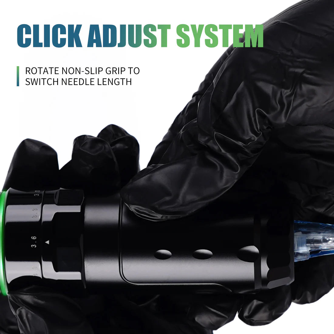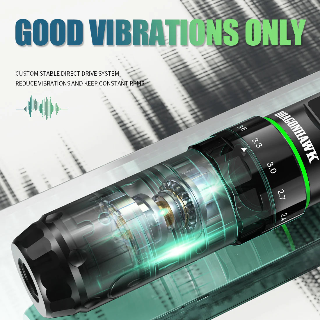 La Pluma de tatuar inalámbrica Dragonhawk L3 ofrece verdadera adaptabilidad de trazo con 7 ajustes reales de longitud de trazo desde 2.4 mm hasta 4.2 mm, permitiendo a los artistas cambiar sin esfuerzo entre delineado, sombreado, relleno y difuminado. Un peso adicional de acero integrado en el agarre mejora el equilibrio y la estabilidad, brindando a los artistas mayor control y menor fatiga en la mano durante largas sesiones.