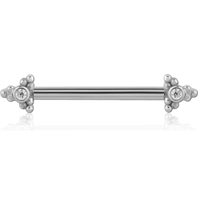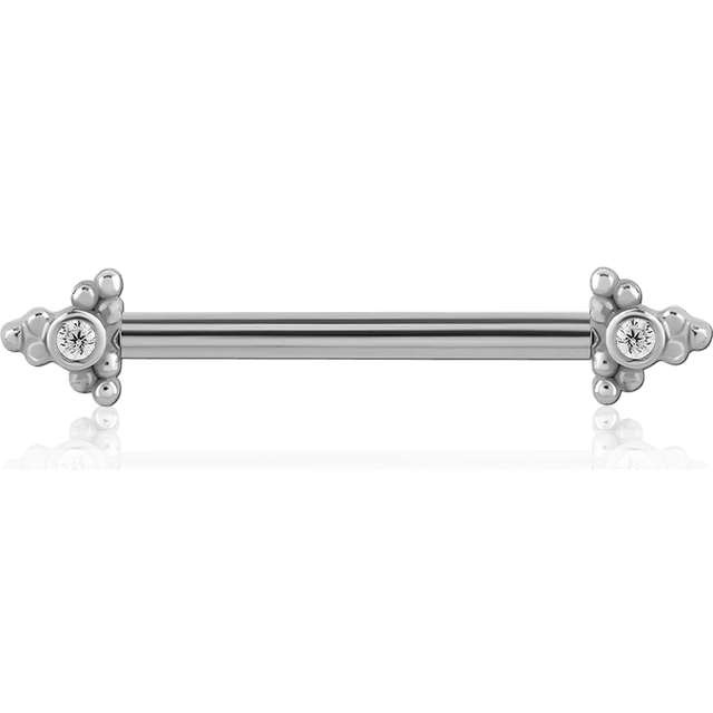 Una barra para pezón inspirada en una flecha, audaz, diseñada para líneas limpias, brillo sutil de cristal y un estilo moderno de piercing.