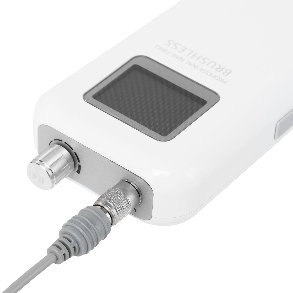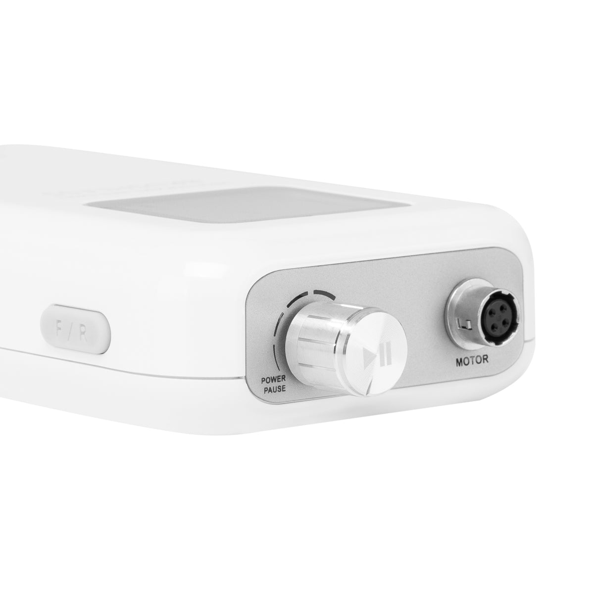 La perilla permite un ajuste suave de la velocidad del cabezal, alcanzando hasta 35,000 revoluciones por minuto, lo que facilita la personalización y comodidad durante diferentes tratamientos. Presionar la perilla permite detener y reanudar el dispositivo inmediatamente (función de pausa), lo que brinda control total sobre el flujo de trabajo. Los botones prácticos ubicados en los laterales permiten cambiar rápidamente al accionamiento por pedal y modificar la dirección de rotación, lo que facilita aún más la adaptación del dispositivo a diversos servicios. La pantalla muestra información sobre la dirección de rotación, estado de la batería, activación del pedal y pausa activa. Además, el dispositivo está equipado con protección contra sobrecarga, que protege el motor del sobrecalentamiento, garantizando mayor seguridad en el trabajo y longevidad del equipo.