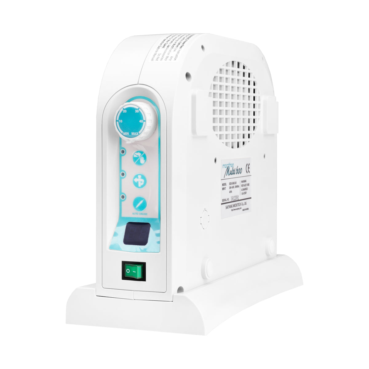 El panel ubicado en la base tiene todas las comodidades. El interruptor de encendido/apagado se ilumina en color verde (¡nunca olvidará apagarlo!). Una perilla que permite ajustar suavemente la velocidad del micromotor. Cambio de rotación a izquierda o derecha. El sistema AUTO CRUISE ofrece la posibilidad de establecer una velocidad constante mientras se usa el pedal / impulso de rodilla. La función de autodiagnóstico permite supervisar el correcto funcionamiento localizando el área defectuosa que se mostrará con el código apropiado en la pantalla digital. Se incluye soporte para el micromotor.
